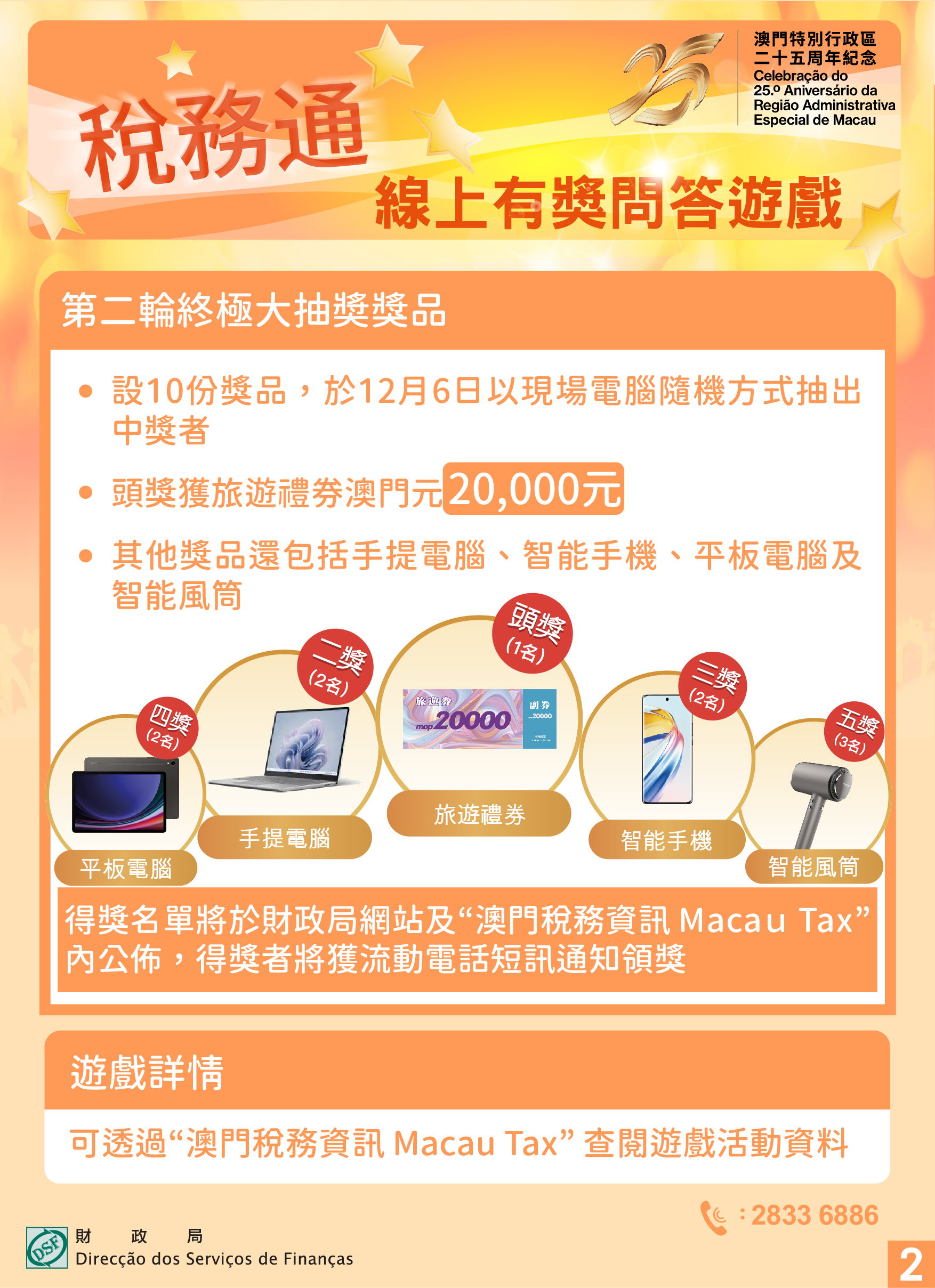 有關問答遊戲詳情,可透過財政局移動應用程式“澳門稅務資訊Macau Tax”查閱遊戲活動資料。如有疑問,可致電財政局電話:2833 6886。