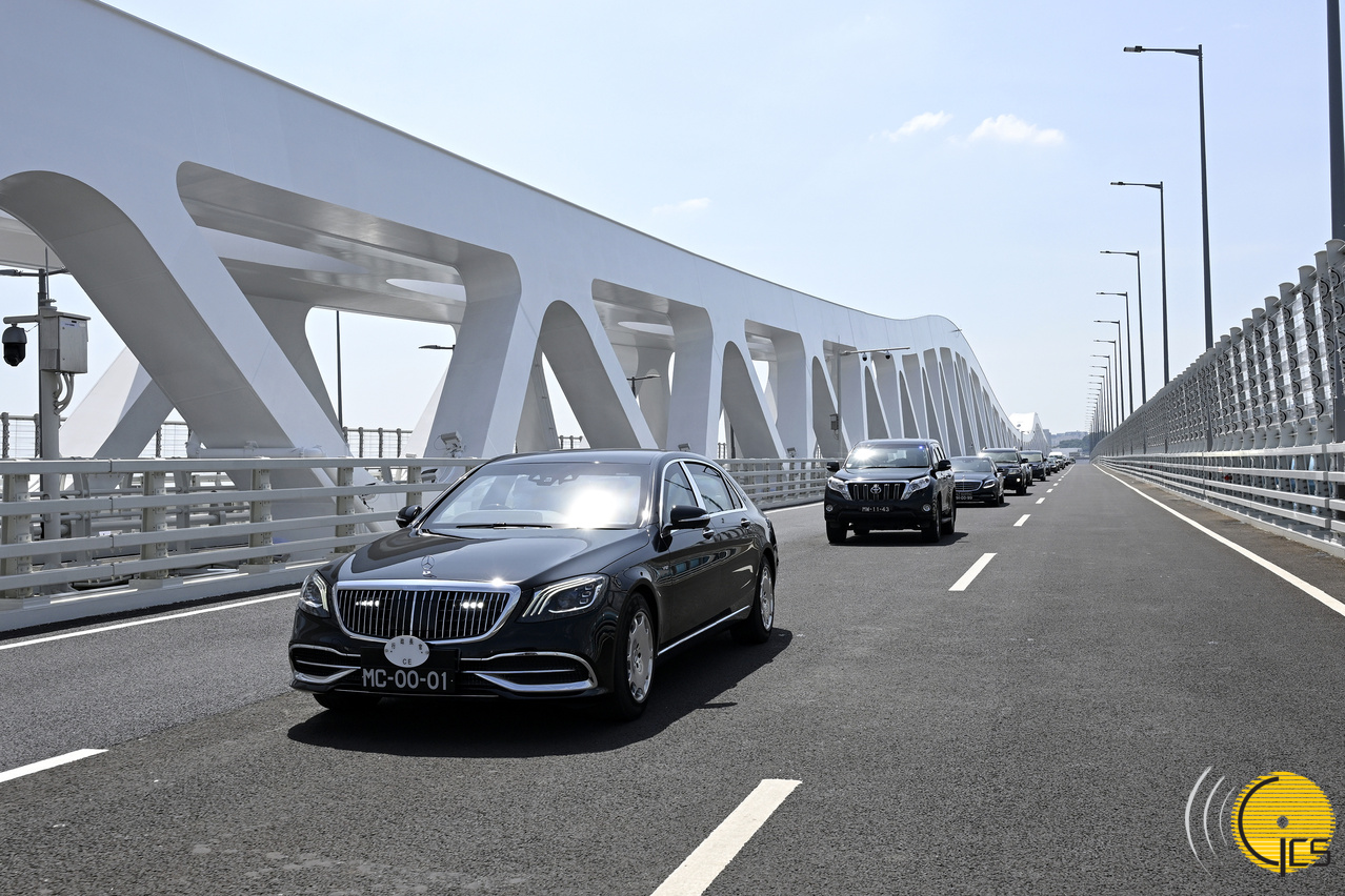 行政長官與一眾主禮嘉賓主持澳門大橋的揭牌儀式後,乘座駕通過澳門大橋前往新城A區。