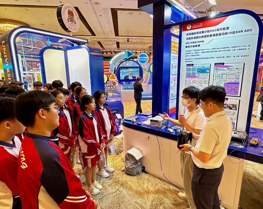 澳大展出的5項科研成果包括:澳大科技學院教授黃輝研發的“澳門 AI 旅遊顧問項目”,澳大應用物理及材料工程研究院副教授周冰樸的穿戴互動式系統,澳大微電子研究院副教授陳知行研發可應用於醫療成像和物聯網等方面的數據轉換器芯片,澳大認知與腦科學研究中心教授袁振為抑鬱症、老人癡呆症等腦部疾病提供的個性化康復方案,以及澳大健康科學學院教授張宣軍的螢光—電流雙信號納米感測器。