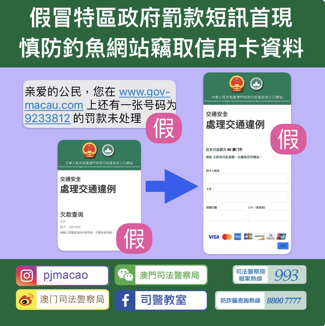 司警局於今日發現有騙徒假冒澳門特區政府名義向市民隨機發送虛假手機短訊,訛稱市民有罰款需要點擊短訊內附帶之連結處理,有關連結進入後為一個假冒「澳門特別行政區政府入口網站」的網頁,倘市民按照頁面要求輸入車牌號碼查詢後,會訛稱市民有「交通違例」罰款需要透過信用卡繳交,以此套取市民信用卡資料後隨即進行未經授權之大額交易,令市民蒙受損失。