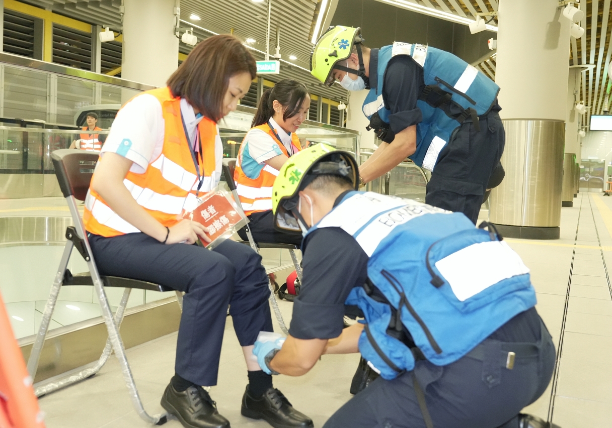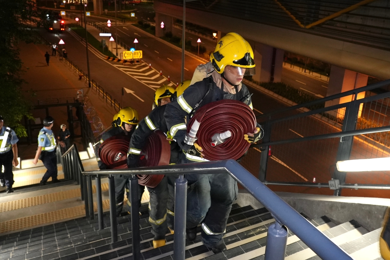 消防局接報後,立即派遣6架緊急救援車輛及23名隊員趕赴現場,按照既定行動預案進行滅火及疏散行動,並對疏散期間受傷的3名傷者進行初步護理後模擬送院治理。