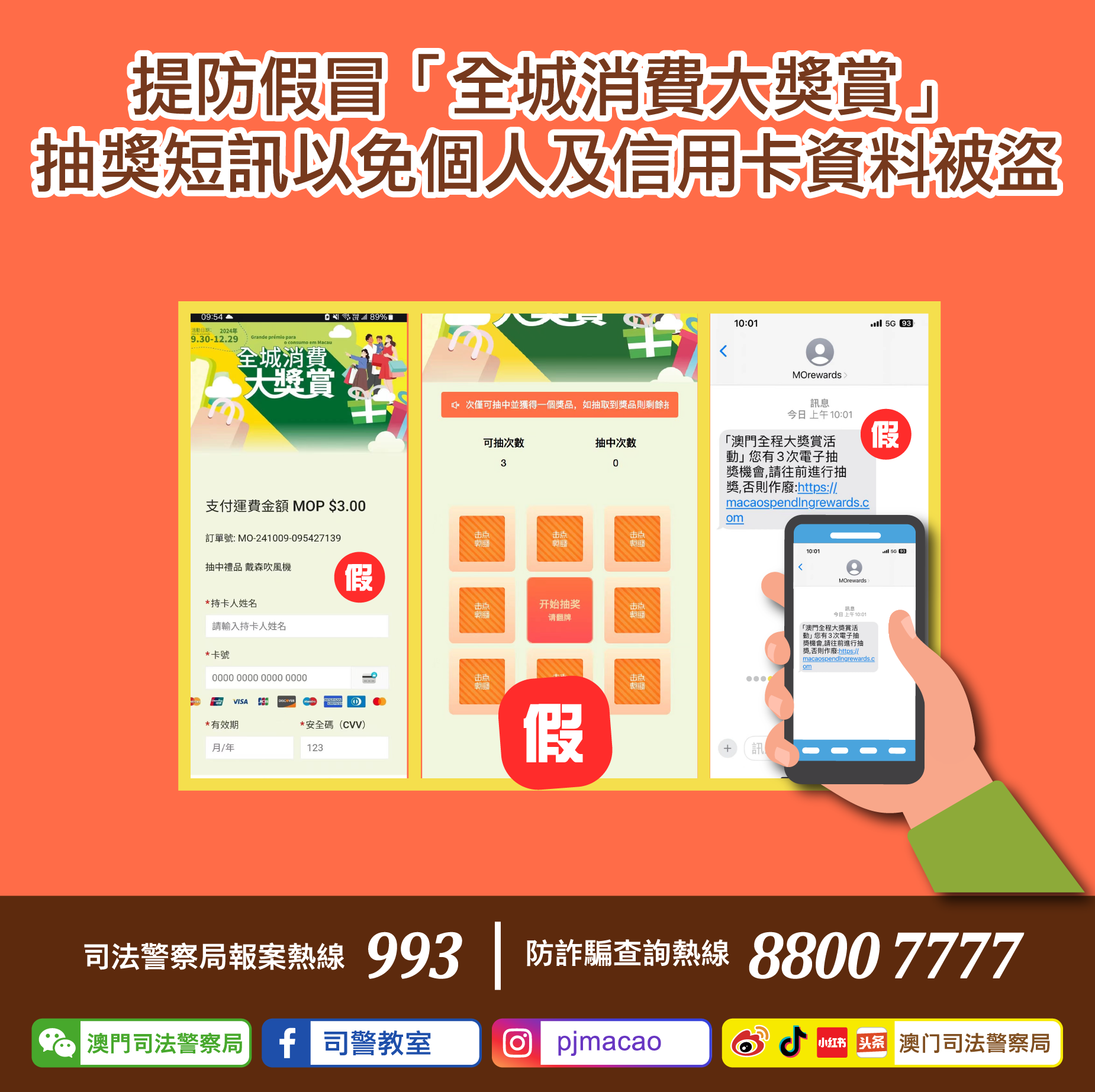 司警局於今日發現有騙徒假冒「全城消費大獎賞」的名義,隨機向市民發送釣魚短訊,短訊內訛稱有抽獎機會,誘騙市民點擊短訊內附帶之連結,有關連結進入後為一個假冒「全城消費大獎賞」的網頁,並訛稱市民已中獎,要求輸入個人資料及信用卡資料,以此套取市民信用卡資料後隨即進行未經授權之大額交易,令市民蒙受損失。