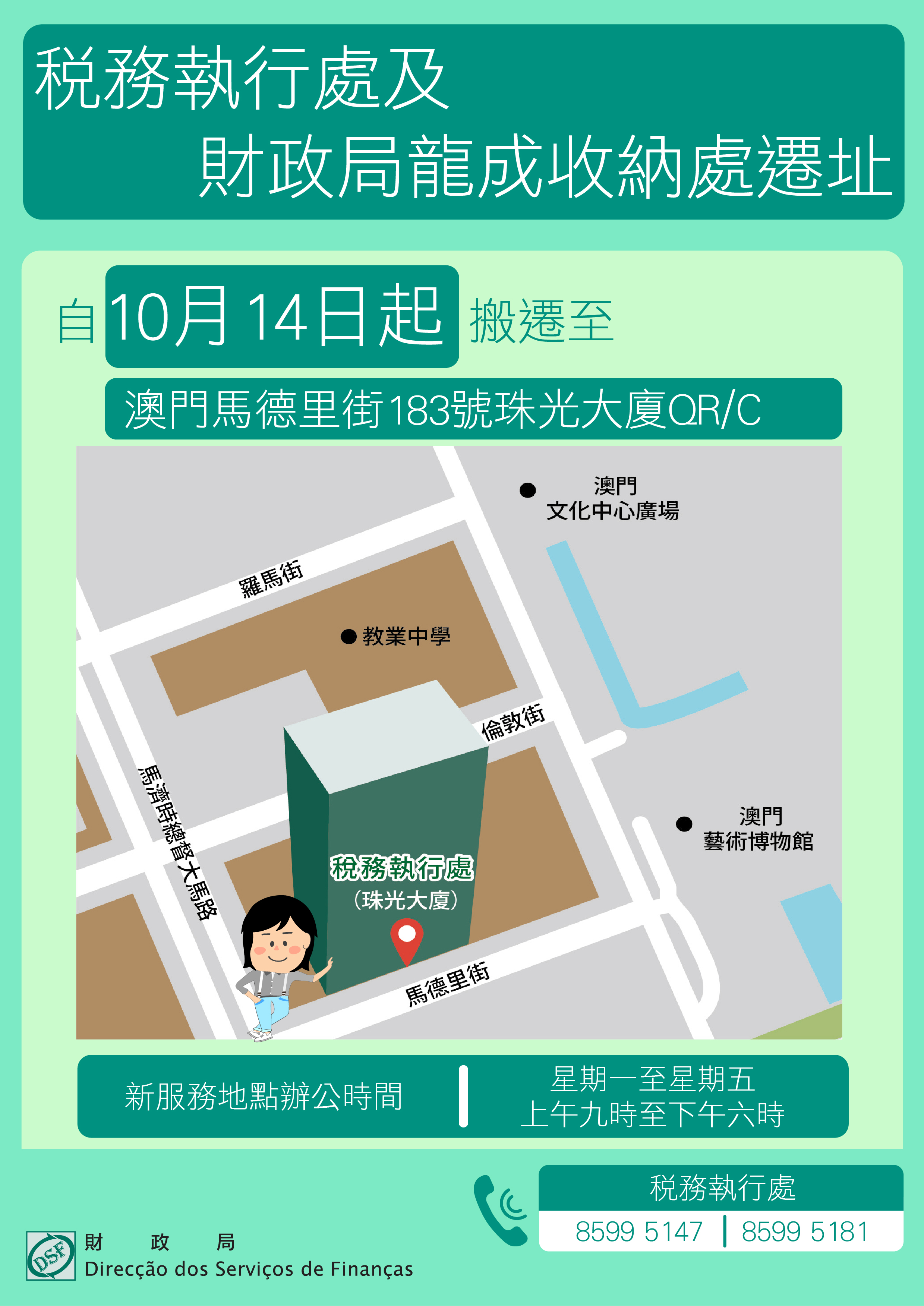 謹此通知,財政局位於澳門羅理基博士大馬路614A至640號龍成大廈地下的“稅務執行處”及“財政局龍成收納處”自10月11日起關閉,並將於10月14日起遷往澳門馬德里街183號珠光大廈QR/C。