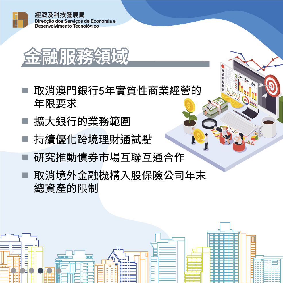 《修訂協議二》增加高新科技、金融服務、視聽文化等服務領域的開放措施,支持澳門“1+4”適度多元發展策略,為澳門經濟適度多元發展創造新空間。科技領域方面,對符合條件的澳門“科技企業認證計劃”企業在內地視同與高新技術企業除稅收優惠外的同等待遇、允許符合條件的澳門服務提供者在內地獲得相關技術資質認可、取消澳門企業在試點地區提供互聯網數據中心等業務的股比限制等。金融服務領域方面,取消澳門銀行5年實質性商業經營的年限要求及境外金融機構入股保險公司年末總資產的限制等。視聽文化領域方面,允許澳門企業投資電影製作、與內地合拍電視劇可視為國產電視劇播出和發行等。