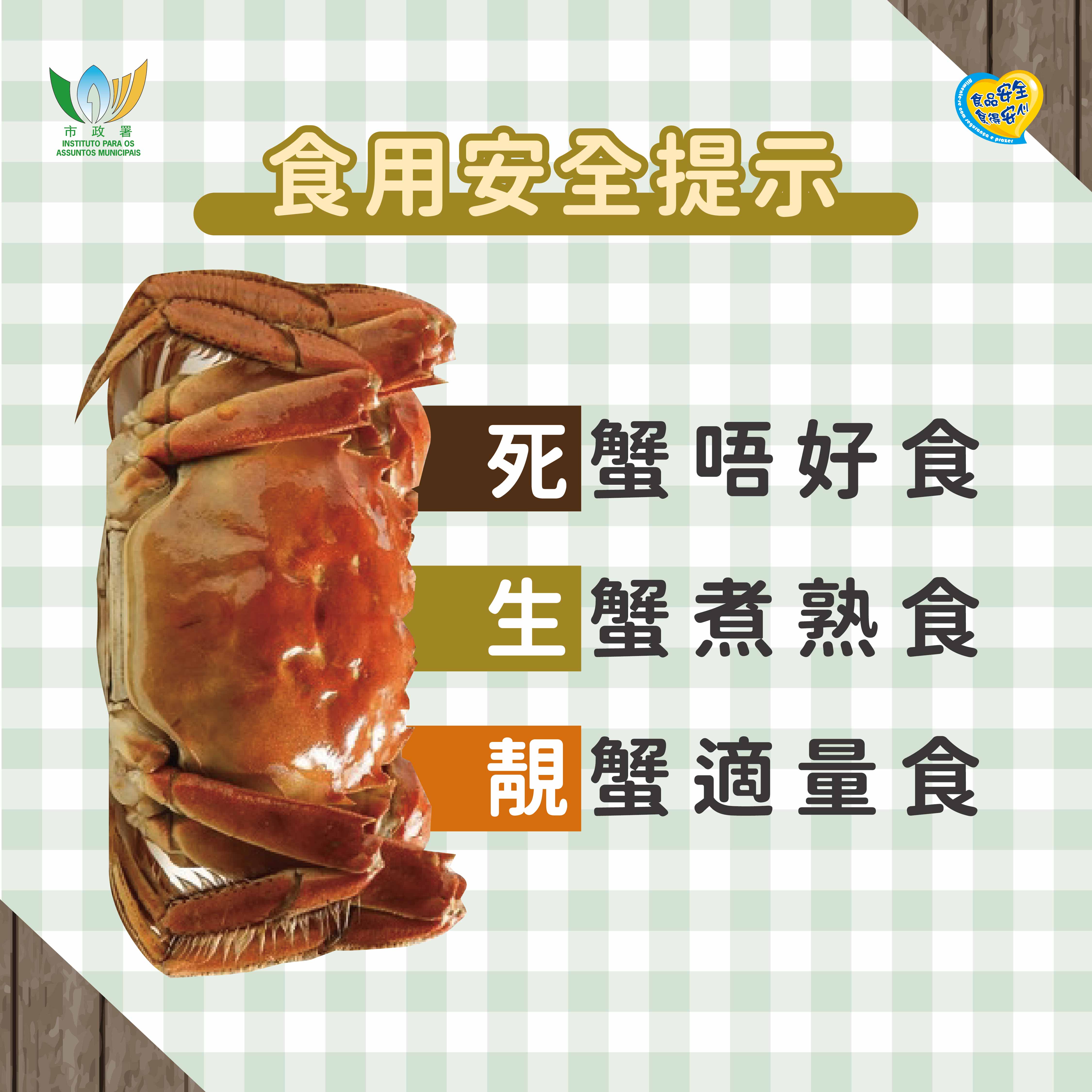 市政署亦提醒市民,應向信譽良好及衛生可靠的店舖選購大閘蟹;若網購大閘蟹,須留意賣家是否合資格的零售鮮活食品場所,並已把登記編號等商戶資料顯示在網上帳戶中。在處理生鮮水產時須注意個人衛生防護,若手部出現傷口更應於包紮後再戴上手套。切勿生吃淡水水產,進食前應徹底煮熟。此外,市民外遊回澳時切勿自攜大閘蟹進入本澳。