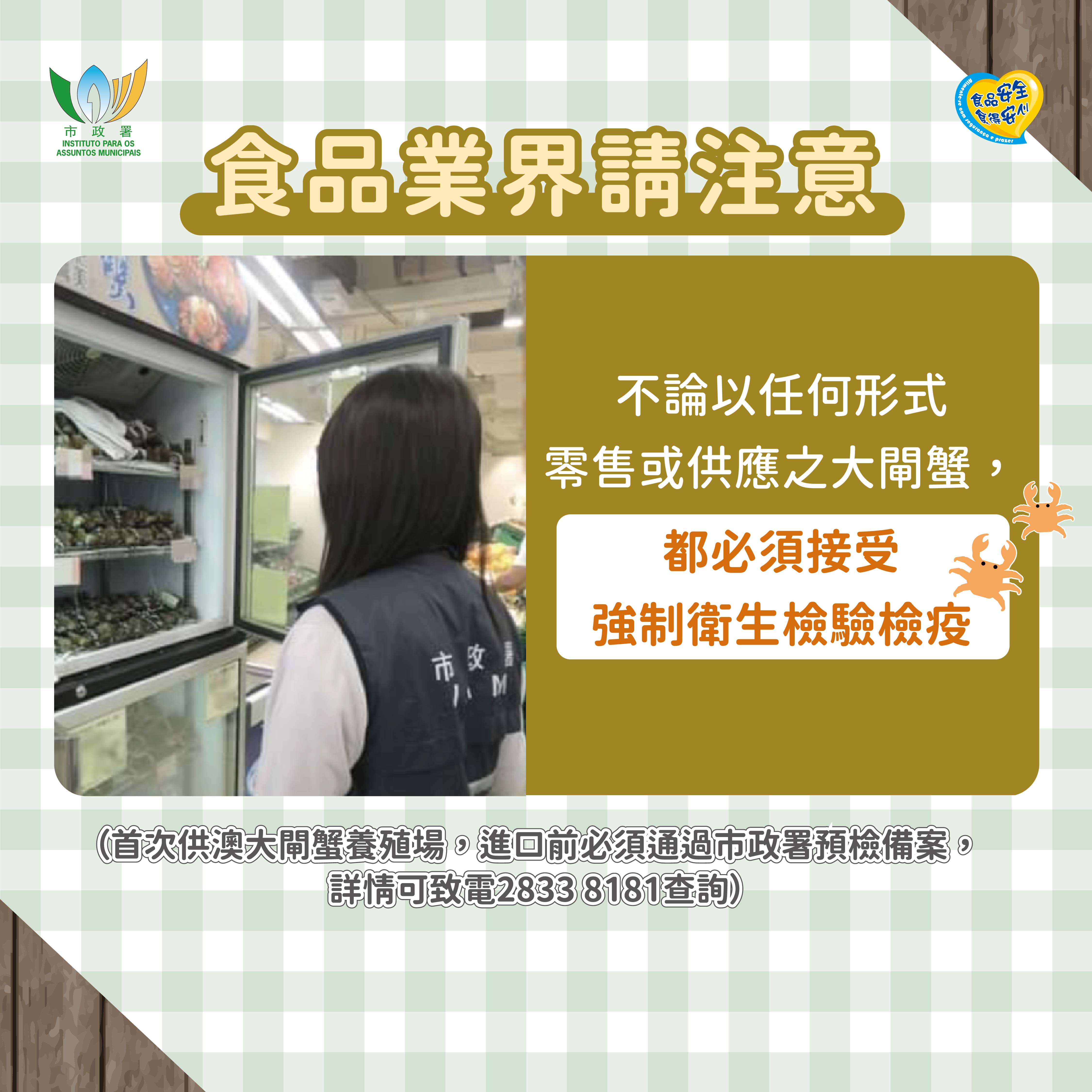 進入大閘蟹消費旺季,市政署持續透過嚴格的入口檢驗檢疫制度及市場巡查機制,從入口到供應零售層面加強對大閘蟹的監管,以保障其品質及食用安全。市政署提醒本澳食品業界,不論以任何形式銷售大閘蟹,均須確保經正途入口及已完成檢驗檢疫,切勿供應及出售未經檢疫之大閘蟹,否則可被檢控。同時,根據“零售鮮活食品場所的登記制度”,所有零售鮮活食品的場所都必須依法登記;如使用互聯網、社交平台或第三方交易平台等作為經營或宣傳媒介,亦須於該平台上顯示場所登記編號等資料,以供消費者識別。