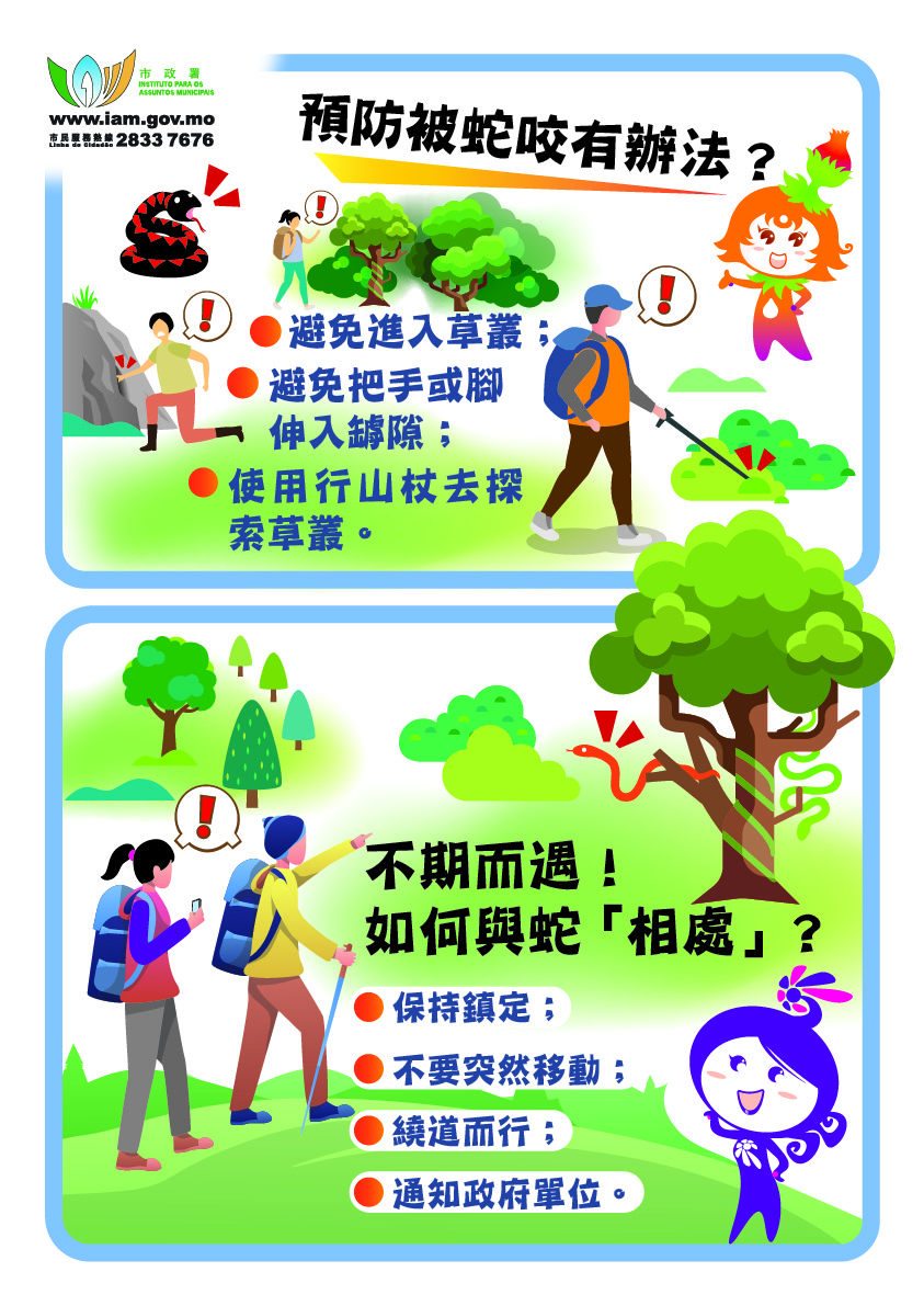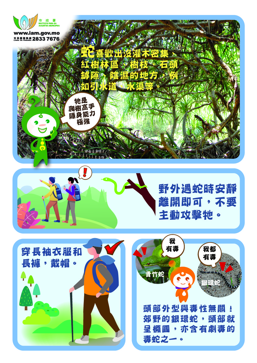 市政署呼籲市民尊重自然和保育,給野生動物生存的空間,“蛇本怕人類,咬人屬自衛。尊重不招惹,和諧共相處。”同時,為了讓公眾在郊遊時能認識更多本澳山林的動植物、山林修復及保育資訊,近年市政署在步行徑上加設生態科普資訊牌,讓市民在遠足郊遊時,更富趣味及教育意義。