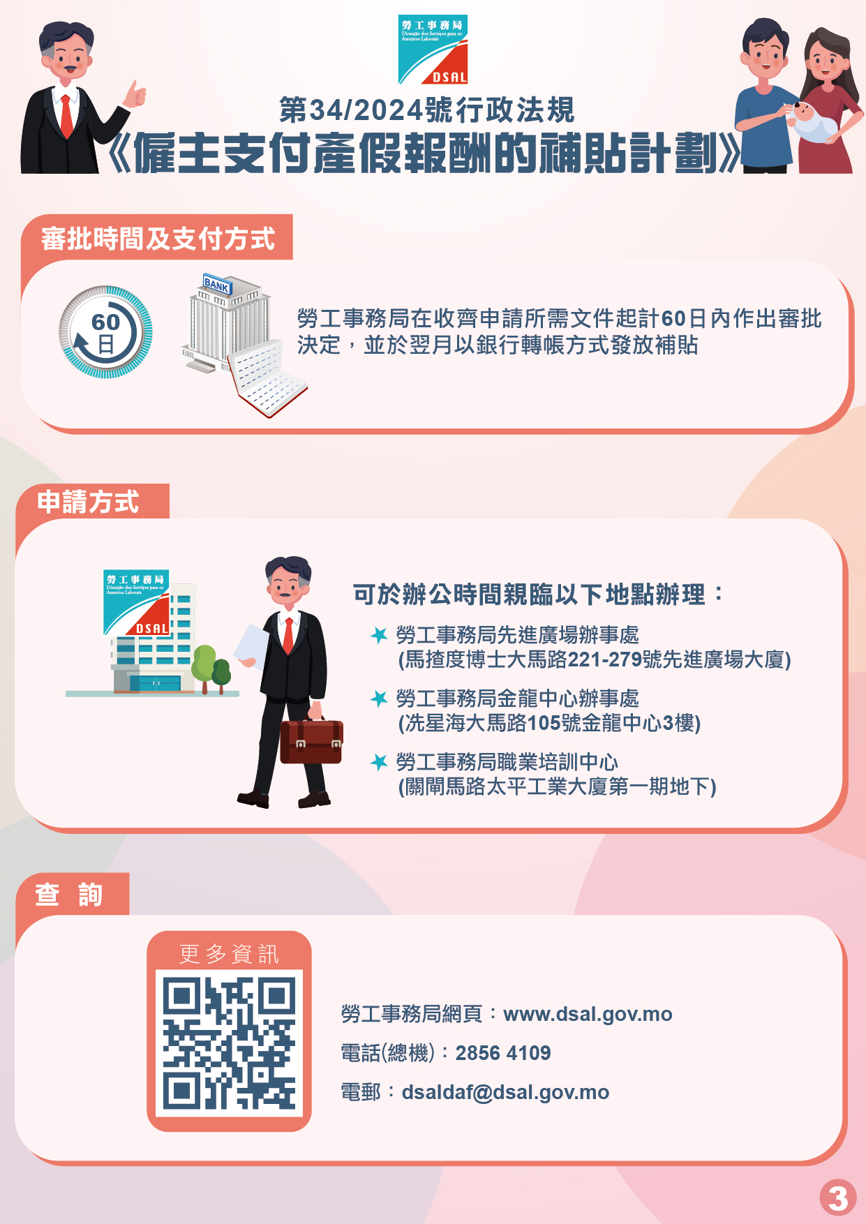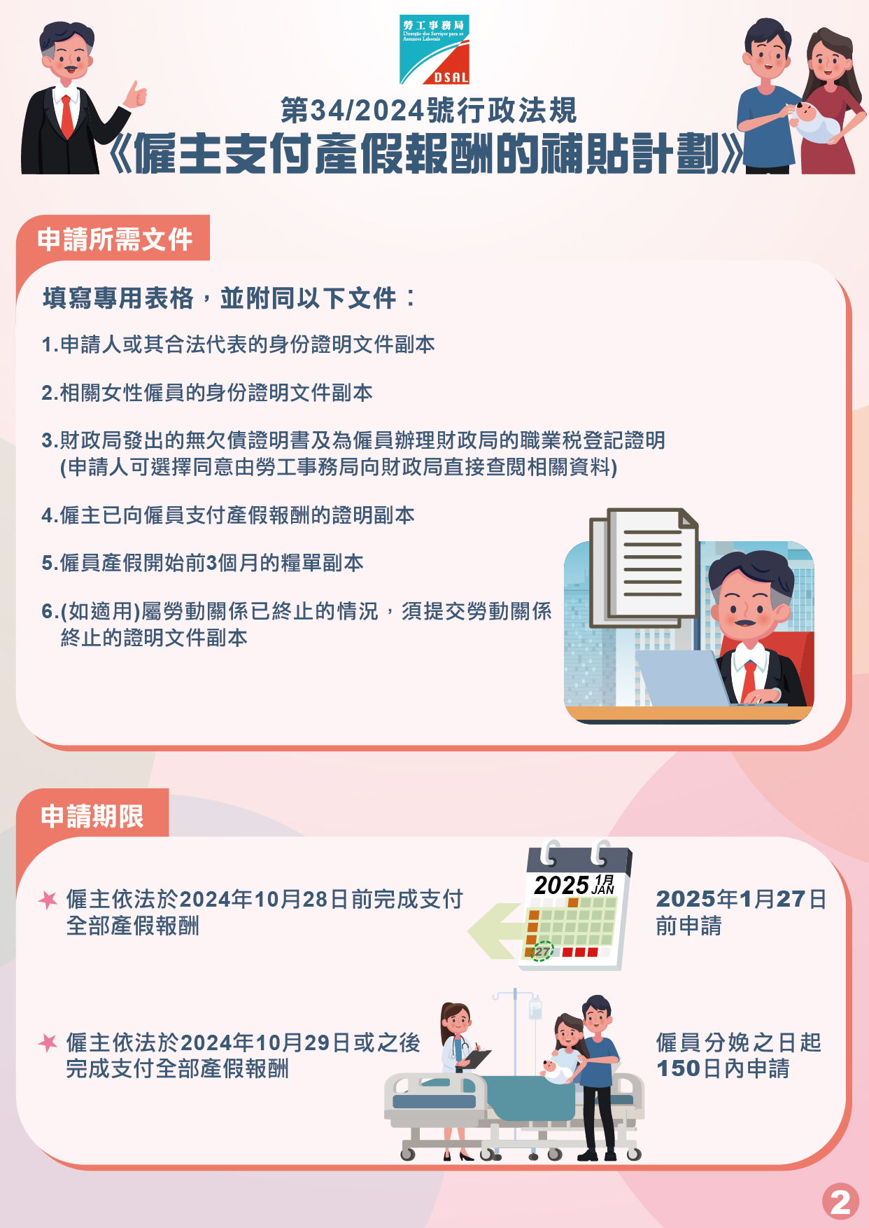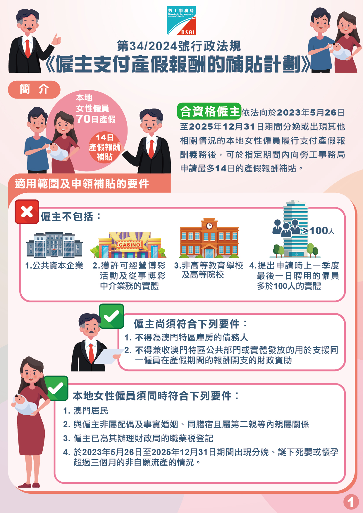 為使僱主逐步適應產假日數的調升,並推動構建和諧的勞動關係,澳門特別行政區政府制定第34/2024號行政法規《僱主支付產假報酬的補貼計劃》,向支付產假報酬的僱主提供臨時性的補貼。