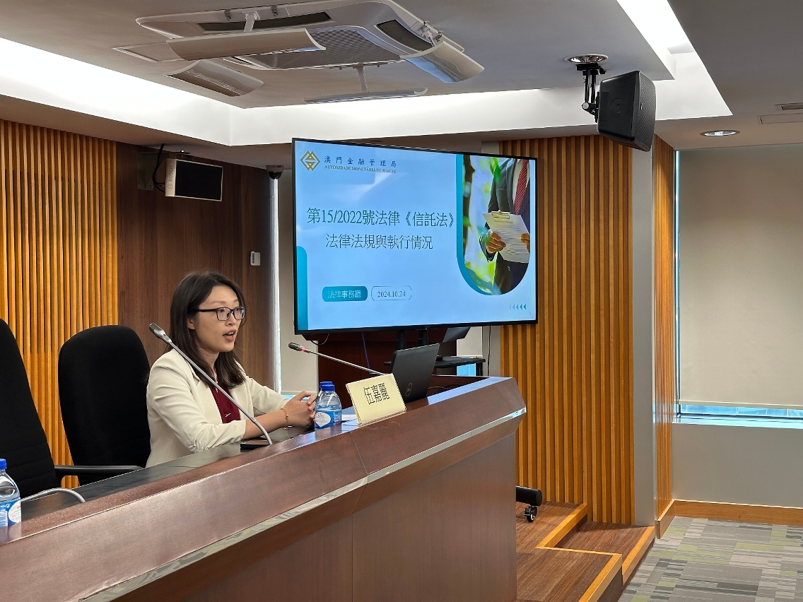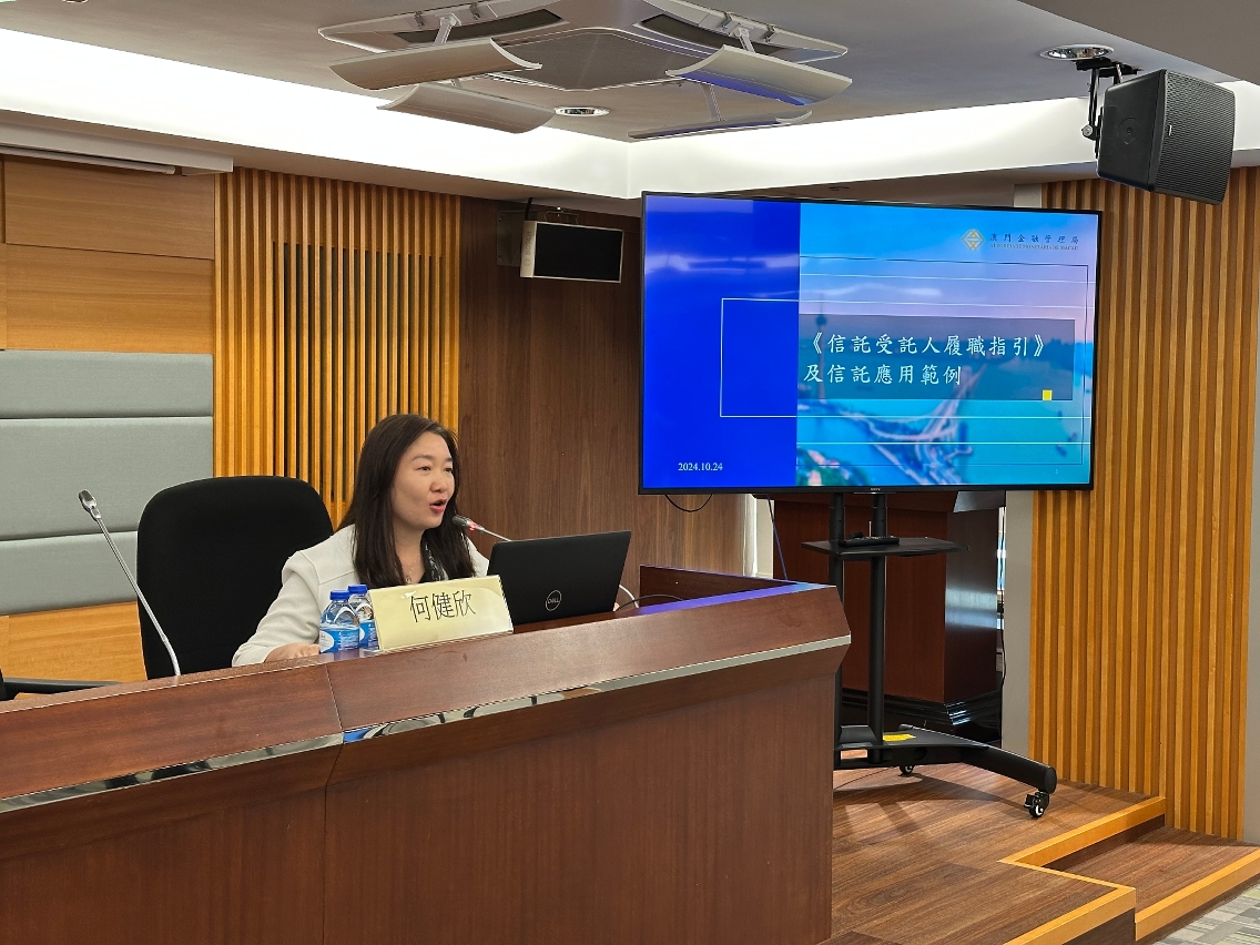 金管局法律事務廳代表於講座上深入講解澳門《信託法》的立法原意、模式及核心原則。隨着《信託法》的推出,公眾可透過金融機構以信託形式進行財產管理,同時允許金融機構透過信託設立投資基金及理財產品。金管局銀行監察廳代表講解澳門信託業務的相關指引及監管要求,並結合當前在本地的業務實踐,分享實務操作的具體案例,並就澳門信託類財富管理業務的發展趨勢,以及相應的監管措施進行探討。