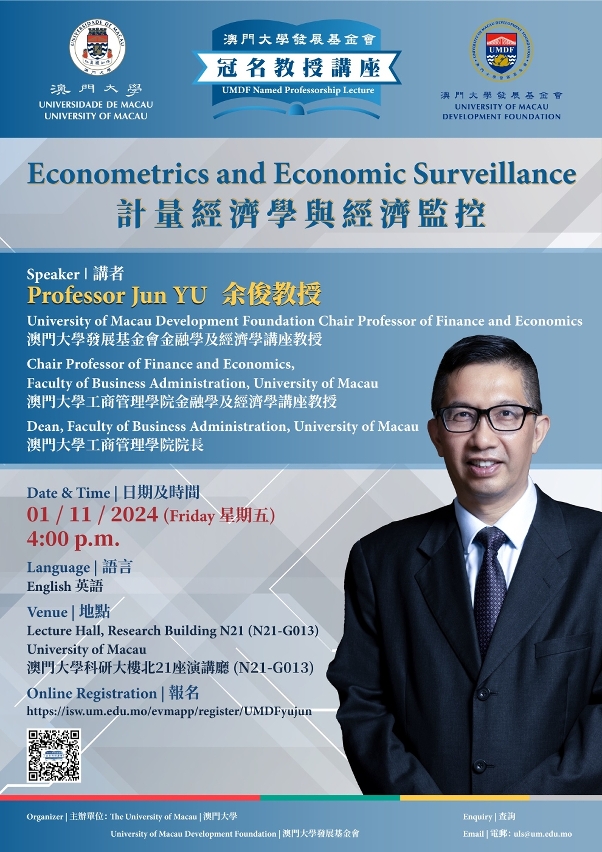 澳門大學將於11月1日(星期五)舉辦“澳門大學發展基金會冠名教授講座”,澳門大學發展基金會金融及經濟學講座教授余俊將就主題“計量經濟學與經濟監控”進行演說,討論資產價格泡沫,以遞歸方法分析各種泡沫特徵,並帶出金融泡沫的相關性。歡迎有興趣人士參加。