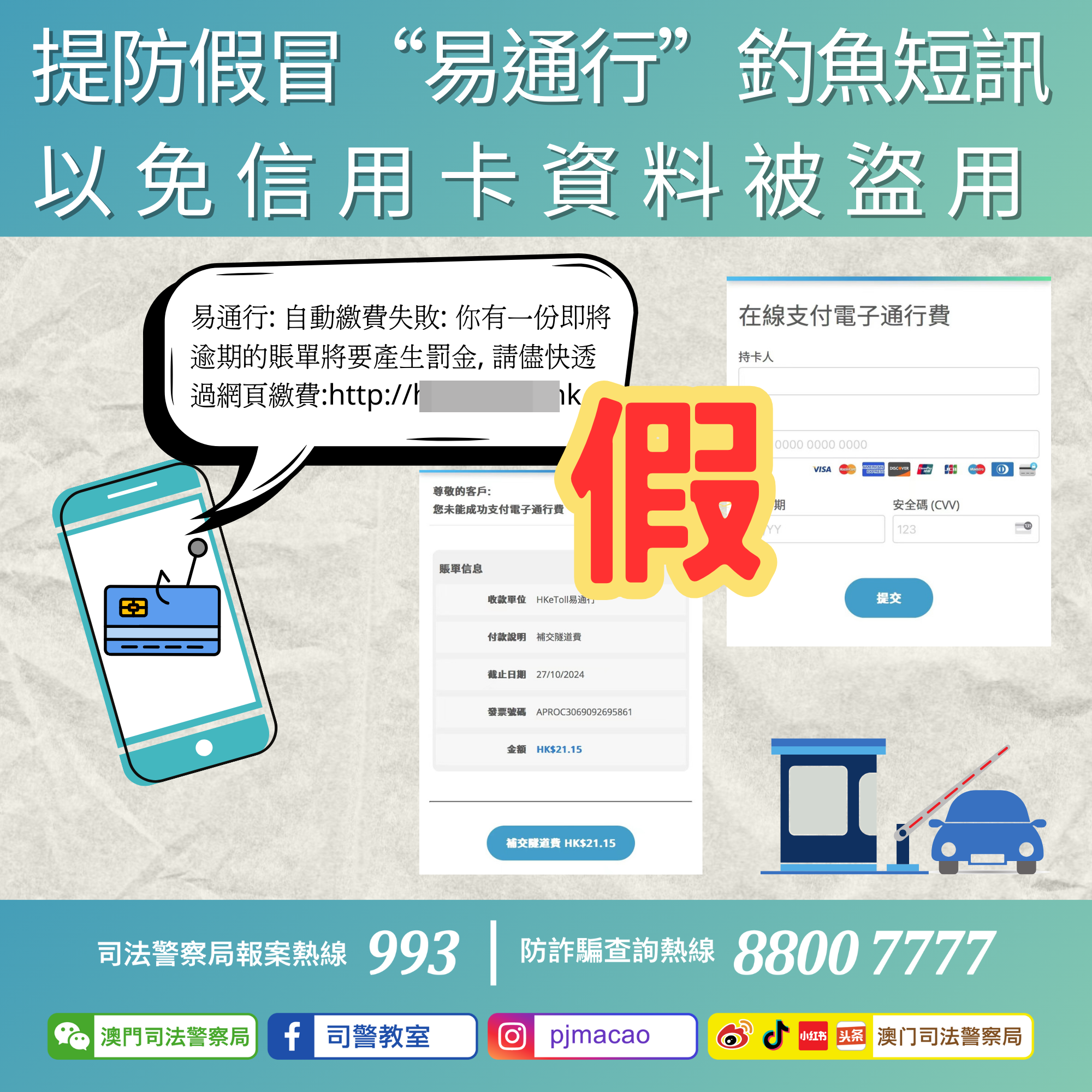 今日(2024年11月4日),司法警察局發現有騙徒假冒香港行車繳費系統“易通行”向澳門流動電話號碼隨機發送釣魚短訊,訛稱市民帳單“即將逾期”並將產生“罰金”,要求市民點擊短訊內附帶之連結進入一個假冒“易通行”的網頁,誘騙市民輸入個人及信用卡資料以補交“逾期費用”,騙徒藉此套取市民信用卡資料並進行未經授權之大額交易。