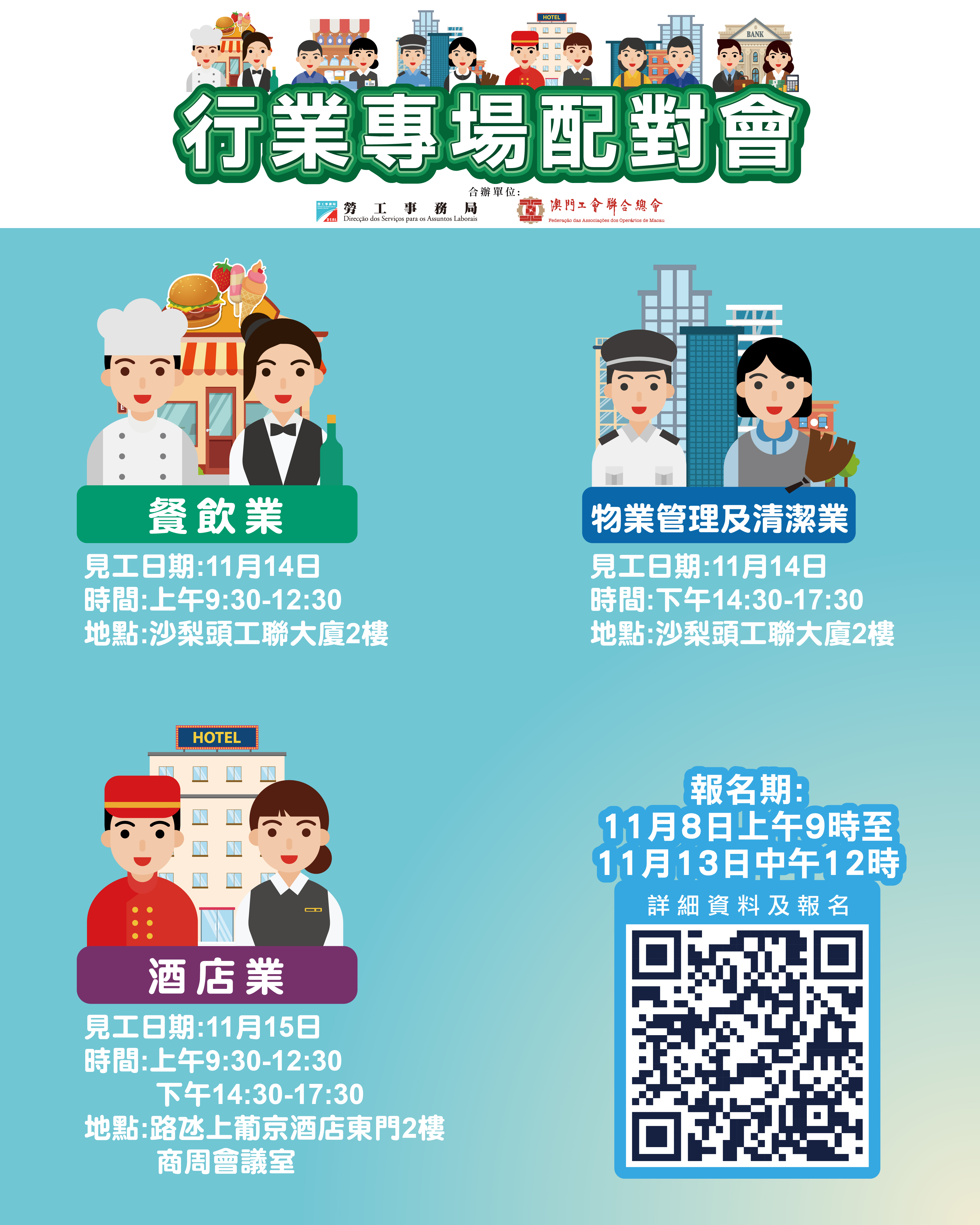 為協助有求職需求的澳門居民盡快就業,以及為緩解業界的人資需求壓力,勞工事務局與澳門工會聯合總會合作11月中旬舉辦3場行業專場配對會,合共提供346個空缺。報名日期為11月8日上午9時至11月13日中午12時。