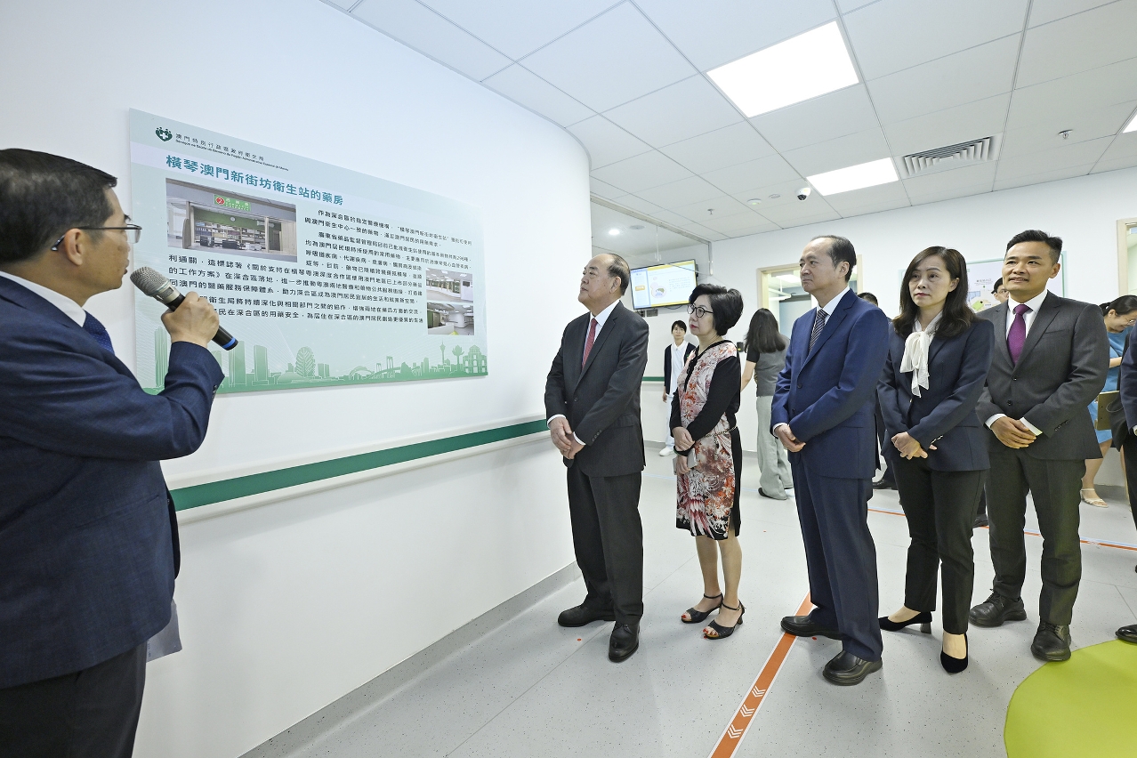 隨後,行政長官賀一誠、鄭新聰主任、歐陽瑜司長、劉利群黨組書記等嘉賓在羅奕龍局長等陪同下,參觀了衛生站內的治療室、藥房、母乳餵哺室及多功能室等,期間詳細聽取了鄭成業副局長的介紹。