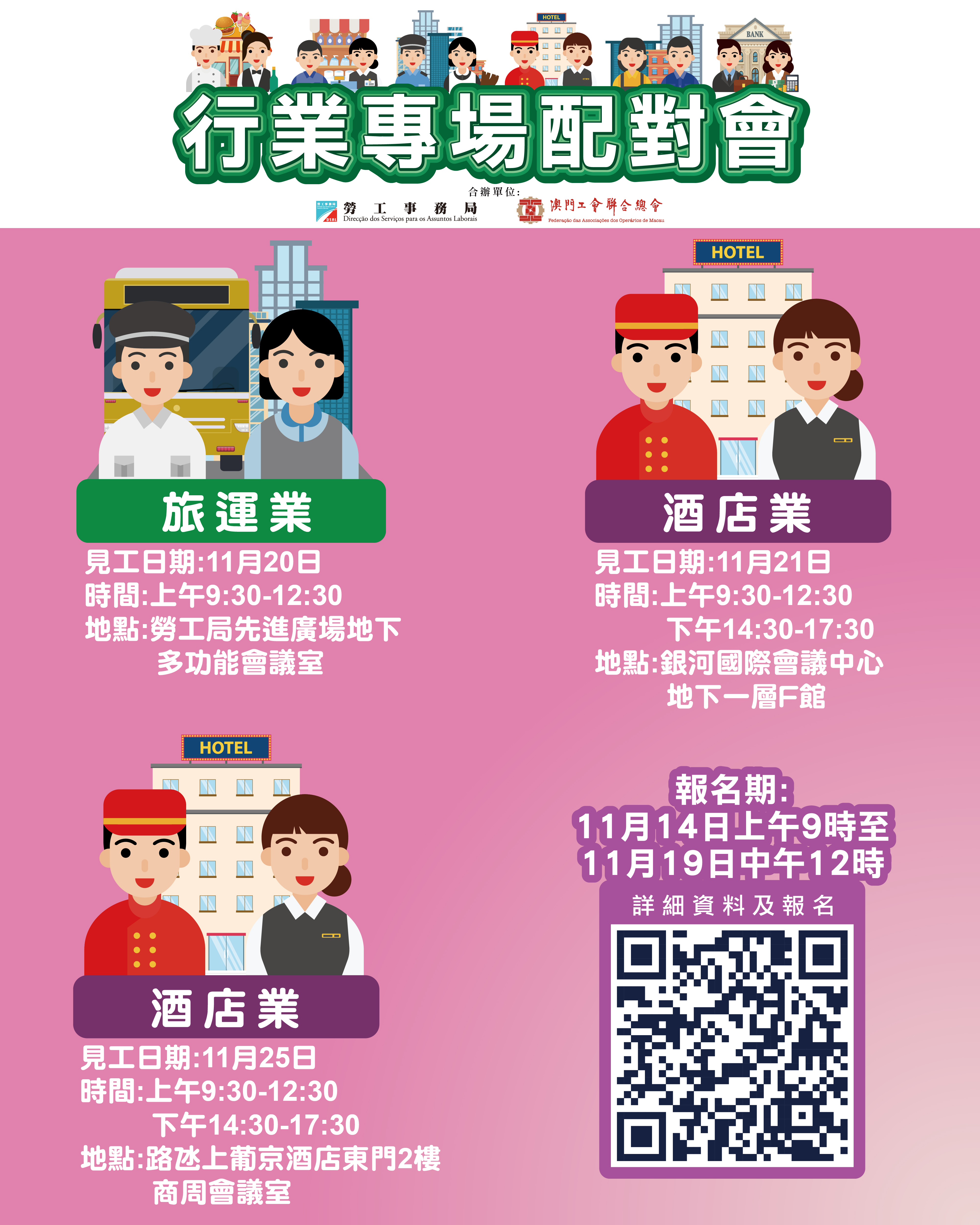 為協助有求職需求的澳門居民盡快就業,以及為緩解業界的人資需求壓力,勞工事務局與澳門工會聯合總會合作11月下旬舉辦3場行業專場配對會,合共提供638個空缺。報名日期為11月14日上午9時至11月19日中午12時。