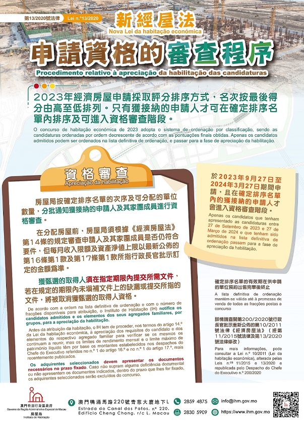 是次申請按第13/2020號法律《修改第10/2011號法律〈經濟房屋法〉》規定開展,申請期由2023年9月27日至2024年3月27日,期間共收到6,562份申請表;補交文件期結束後,房屋局隨即展開審查,並按已獲接納的申請的排名編製臨時排序名單及被取消申請資格的名單。