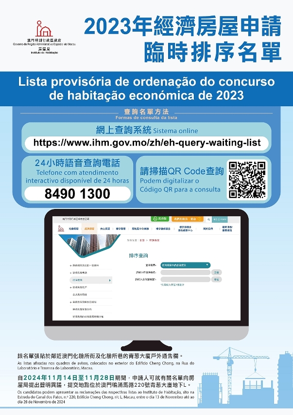 申請人可透過房屋局網頁的排序查詢系統(https://www.ihm.gov.mo/zh/eh-query-waiting-list)、微信及24小時語音電話(8490 1300)查詢申請情況。