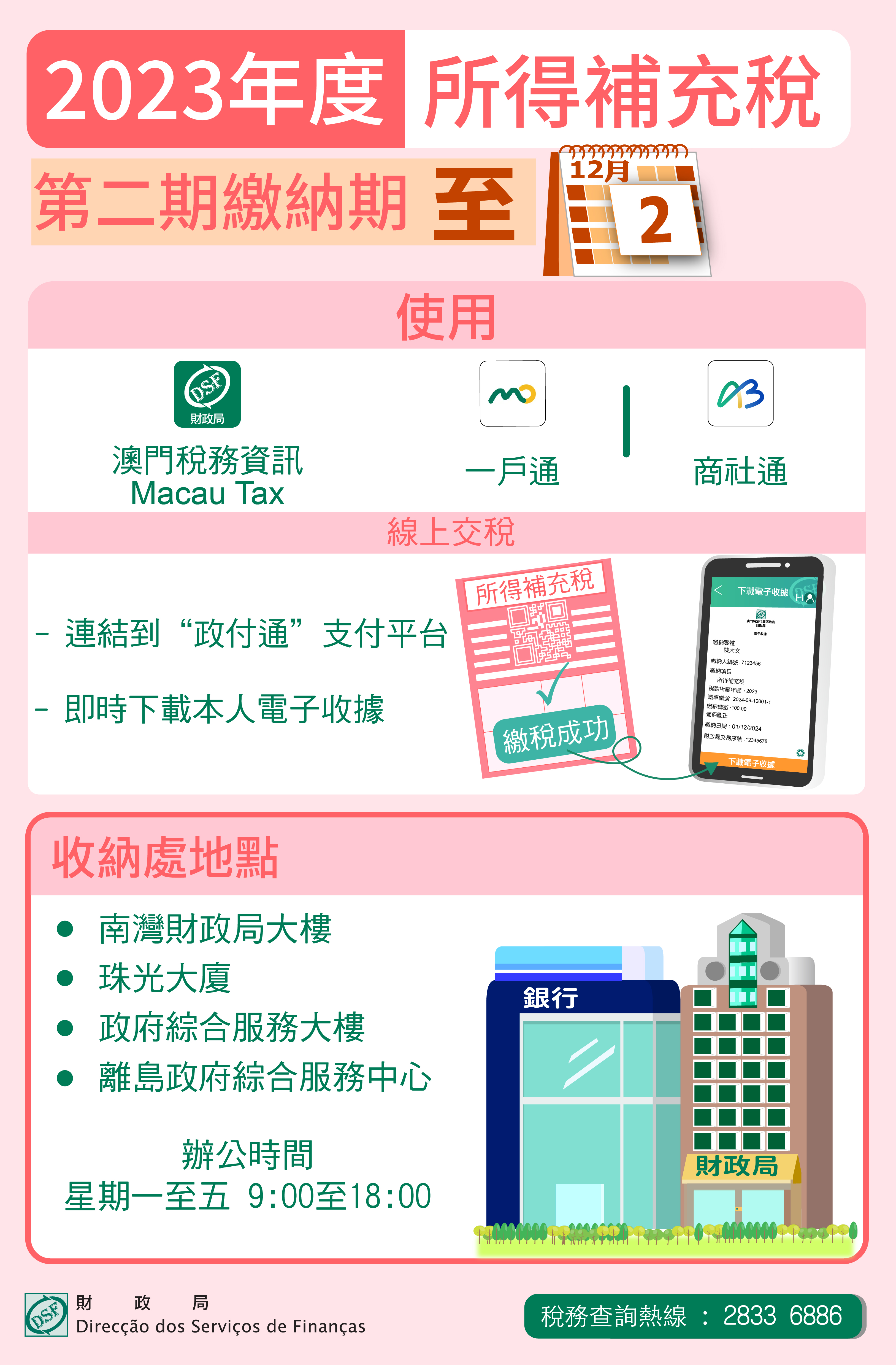 財政局提醒所得補充稅納稅人,繳納月份為11月之第二期所得補充稅,最後繳納期限至12月2日。為免因逾期繳納而附加過期利息及罰款,仍未繳納上述稅款之納稅人須儘快繳納。