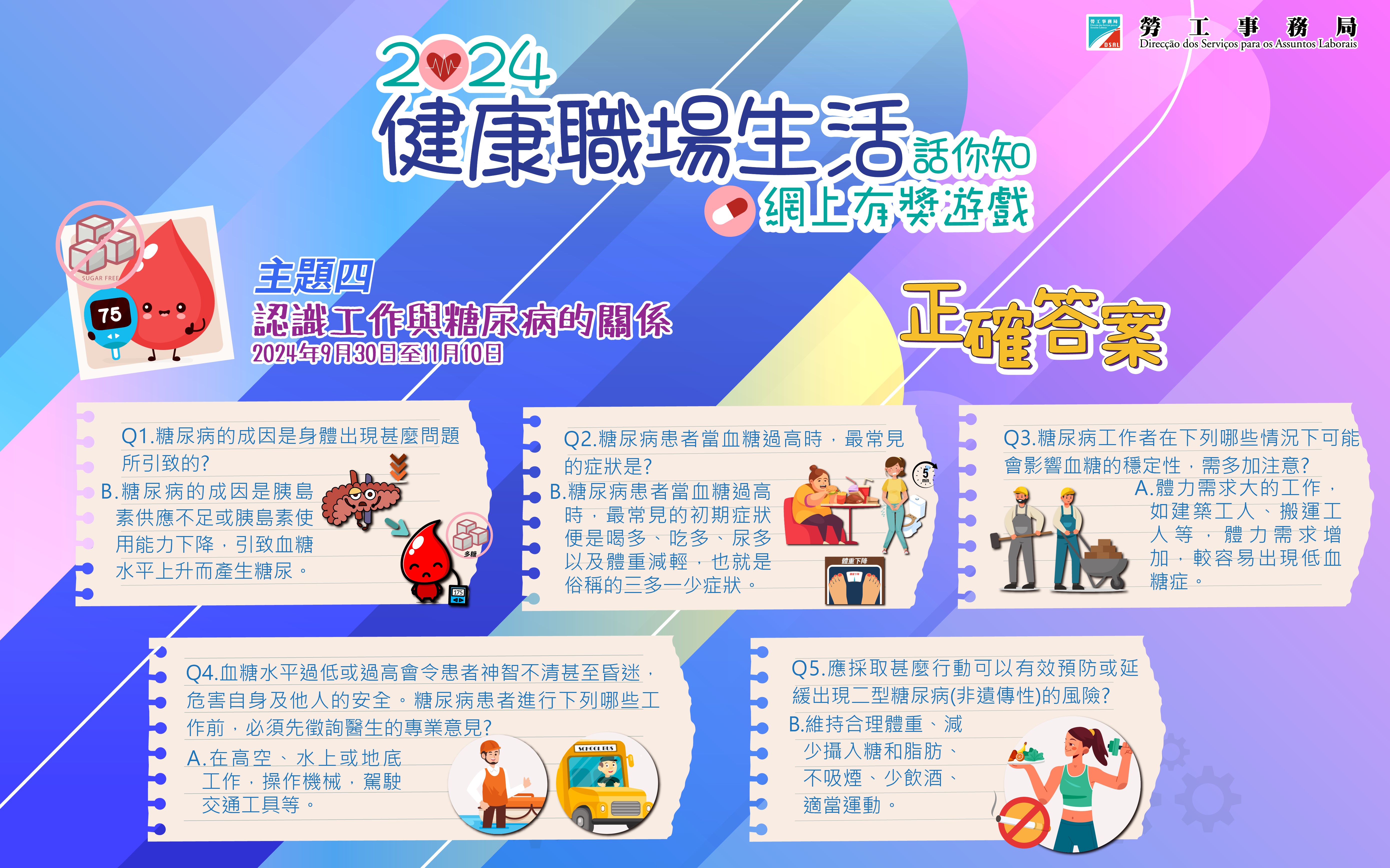 為持續提升市民的職業安全健康意識,加強對工作安全和健康的關注,勞工事務局於本年5月至11月期間舉辦「健康職場生活話你知」系列有獎問答遊戲,四期活動共有16,276人次參加。其中,第四期以「認識工作與糖尿病的關係」為主題的問答遊戲已於11月10日結束。是次活動反應熱烈,共有4,544人次參加,當中有4,218人次答對全部問題。