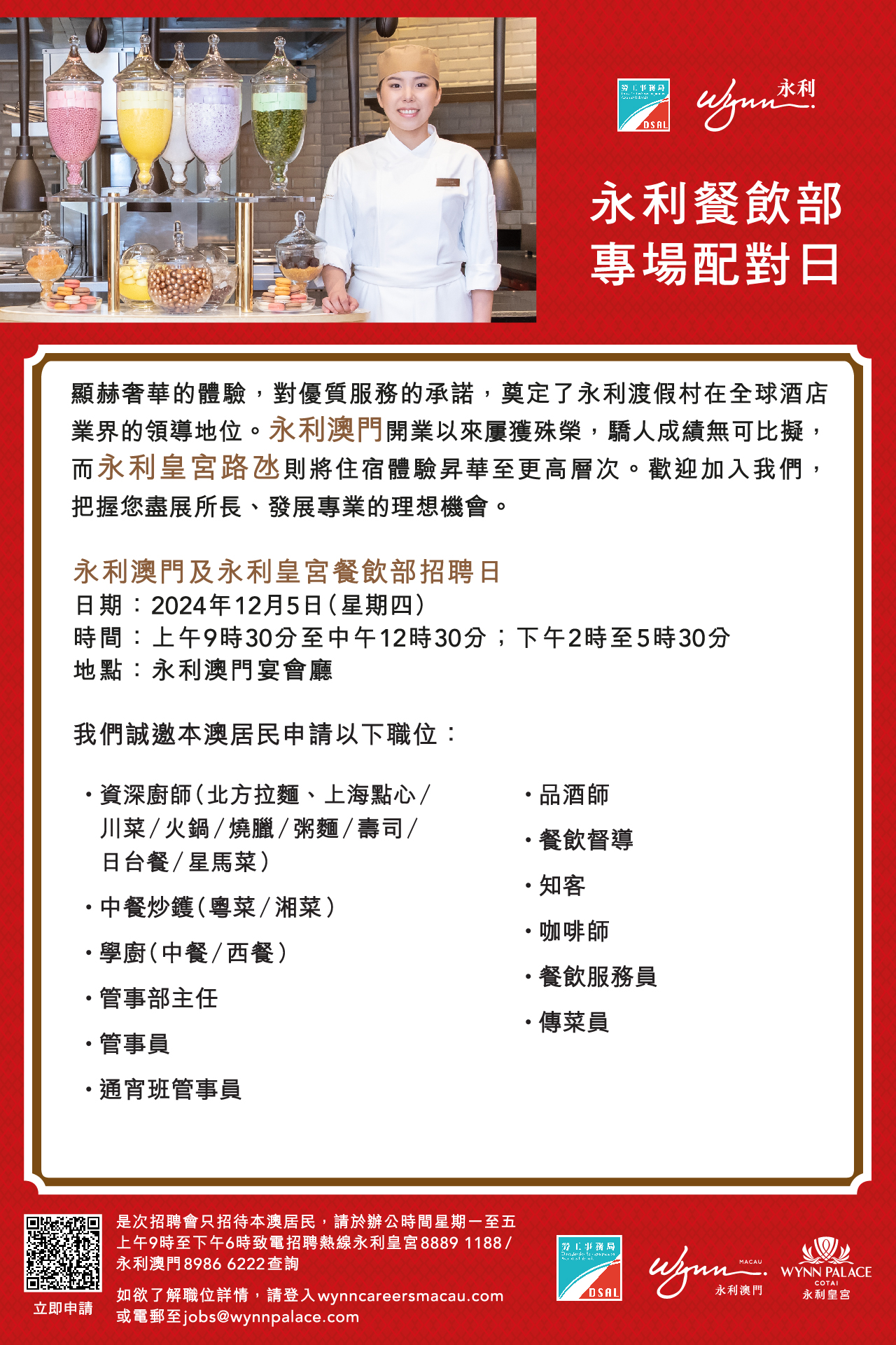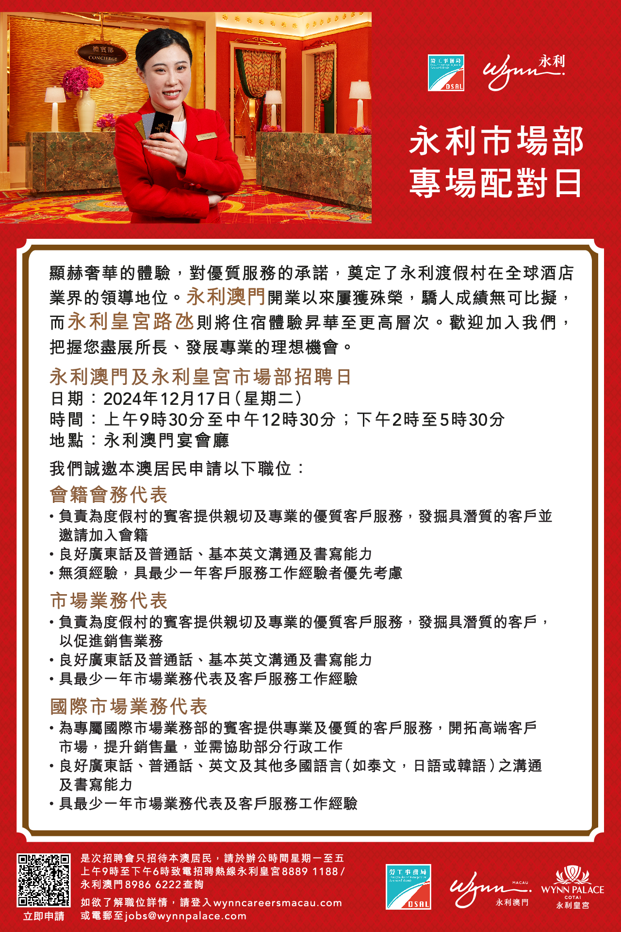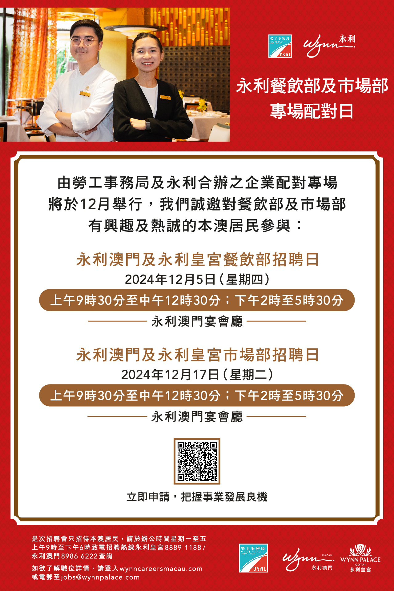 倘有查詢,可於辦公時間內致電勞工局就業廳8399 9856、8399 9821(關先生/何小姐)及永利招聘部熱線88891188。