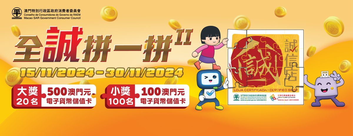 為加深消費者對“誠信店”優質標誌的認識,消費者委員會舉辦的“全誠拼一拼”(第二期)活動即將於本周六(30日)結束,於活動結束前年滿三歲,持有效澳門居民身份證人士均可參加該網上拼圖有獎活動。