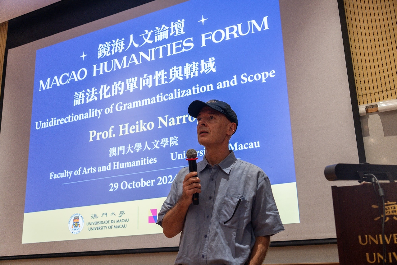 澳門大學人文學院舉辦“鏡海人文論壇”,由日本東北大學教授Heiko Narrog以“語法化的單向性與轄域”為題發表演講,吸引眾多師生線上線下參與。
