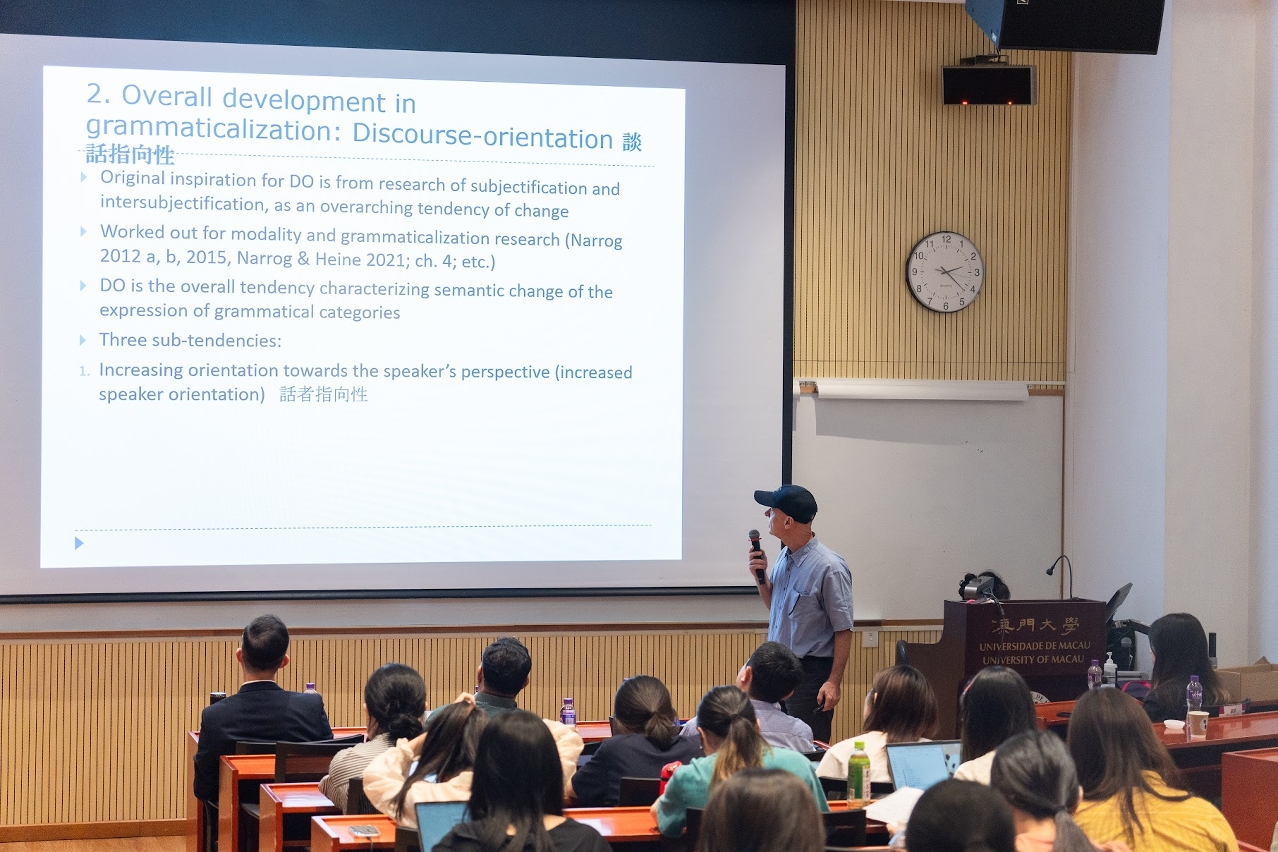 澳大人文學院助理院長鄺耀基致辭時指,世界各地的語言由古至今都經歷語音、語義和句法的演變,其中語法化是一個重要現象。澳大日文系系主任楊文江介紹了Narrog的學術成就,指他分別於德國波鴻魯爾大學和日本東京大學獲得博士學位,並在美國加州大學柏克萊分校、哈佛燕京學社、日本國立國語研究所等學術機構擔任訪問學者。Narrog的研究方向包括語言類型學、情態、語法演變(尤其是語法化)以及語義地圖,著作涵蓋多部由牛津大學出版社出版的專著和合編手冊。他還發表了200多篇高水平期刊、書籍章節及書評。