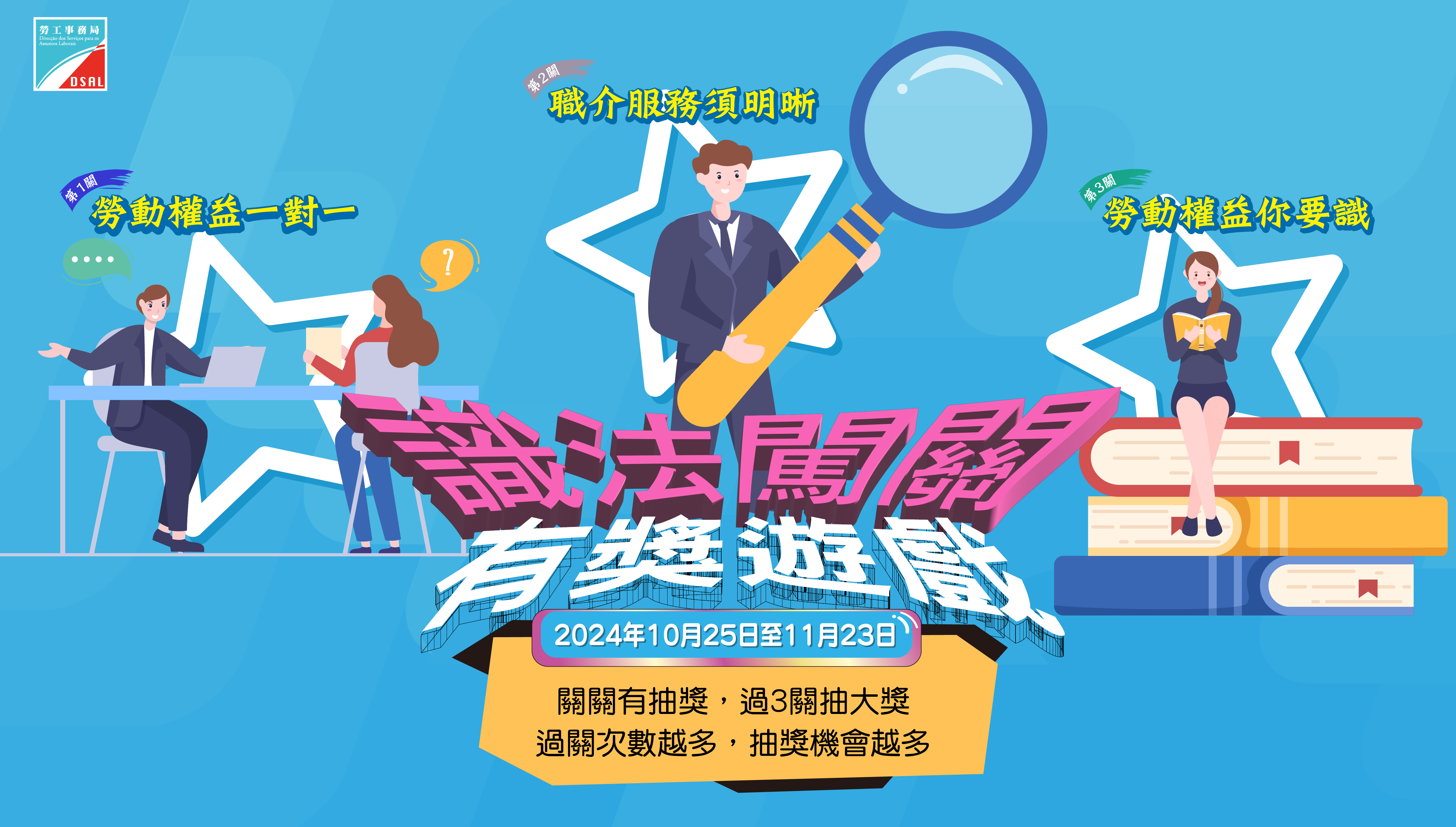 為持續向公眾推廣勞動權益,勞工事務局於2024年10月25日至11月23日期間推出「識法闖關」有獎遊戲活動,已順利完成,有關得獎者將獲電話短訊通知領獎安排。