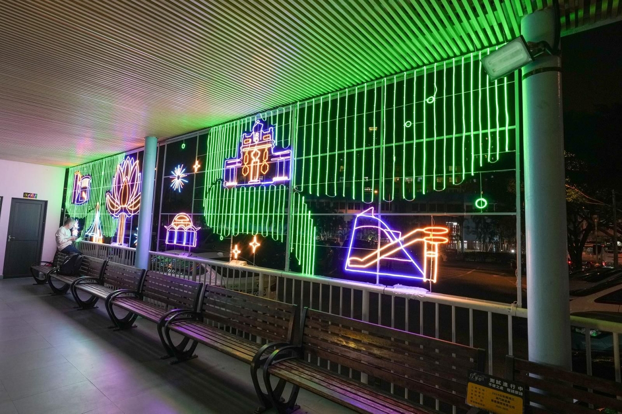 氹仔消防局前地(木偶葡國餐廳立面):旅遊局早前開展3D光雕表演作品公開徵集計劃選出的兩個優秀項目分階段上演; “雙·連”主題作品在2024年12月7日至2025年1月17日上演、2025年1月18日至2月28日上演另一主題作品“100 FUN”。