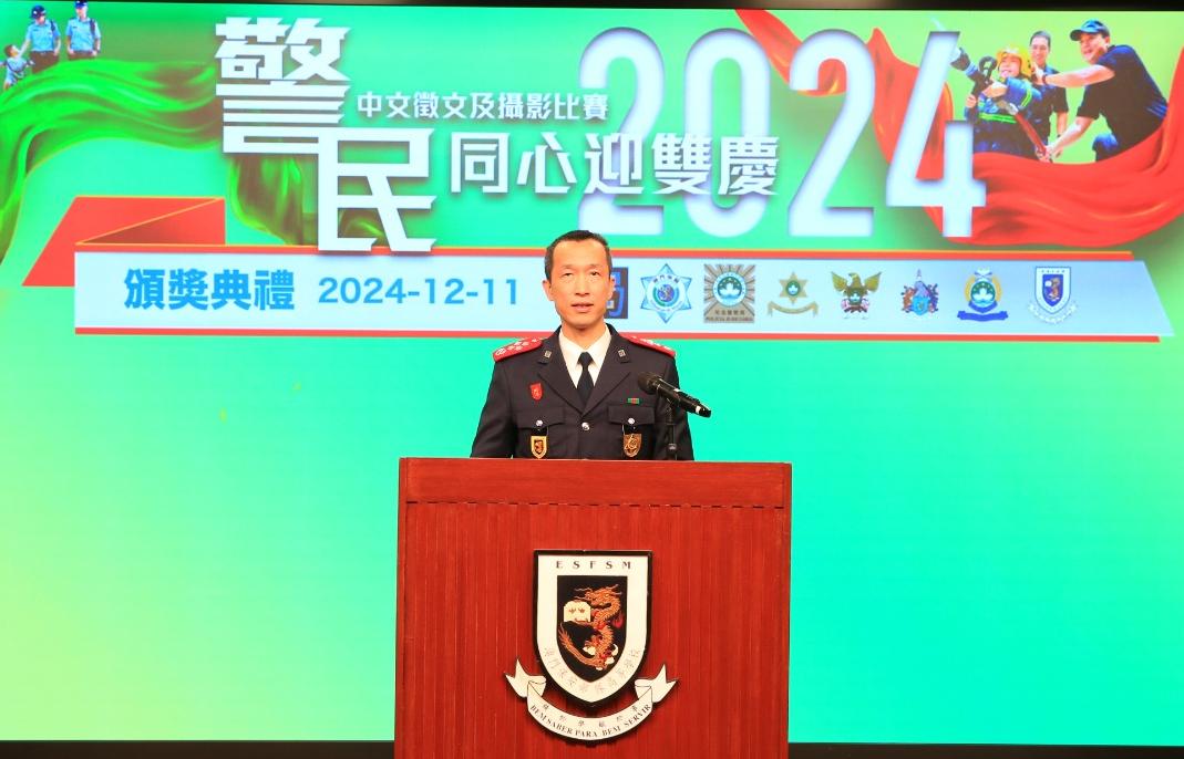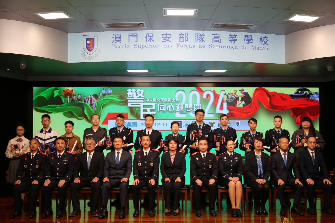 12月11日,由澳門保安部隊及保安部門合辦的“警民同心迎雙慶”中文徵文及攝影比賽,在澳門保安部隊高等學校禮堂舉行頒奬典禮。邀請到澳門保安部隊及保安部門的領導層、賽事評委、各組別的得獎者,以及高等院校和中學代表約130人出席,共同參與這項舉辦至第十年的建設警隊文化活動。