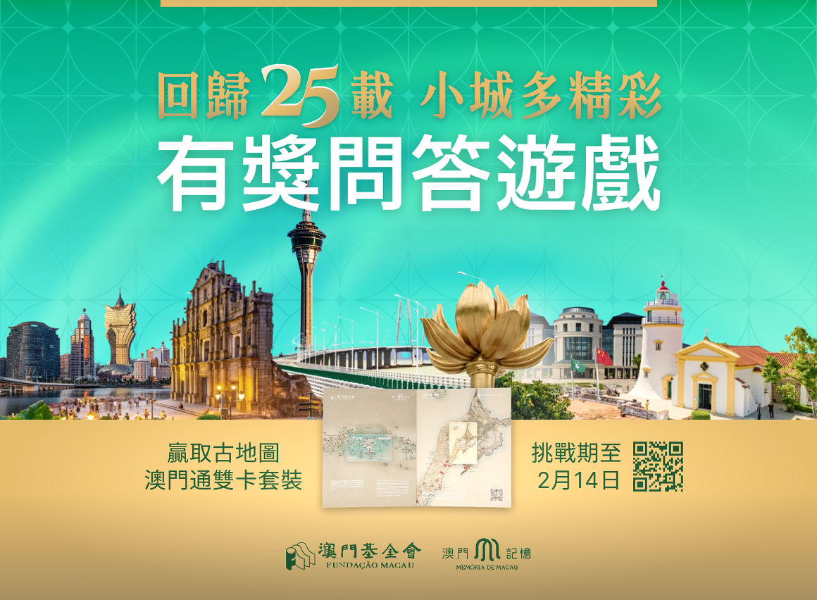 澳門回歸祖國25年來,在中央的大力支持下,特區政府團結帶領社會各界協同奮進,推動經濟適度多元發展,擴大對外交流合作,邁進新時代發展的征途,譜寫了具有澳門特色“一國兩制”成功實踐的華彩篇章。為慶祝澳門特別行政區成立25周年,由澳門基金會開展的“澳門記憶”文史網,特推出“回歸二十五載 小城多精彩”網上有獎問答遊戲。