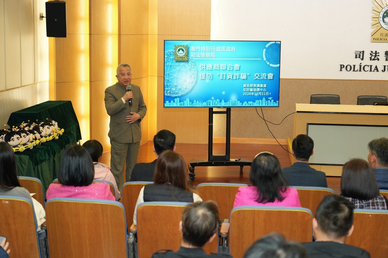 “提防訂貨詐騙交流會”於2024年12月11日在司法警察局舉行,司警局資訊罪案調查處龍漢威處長、澳門供應商聯合會李傑興理事長聯同21名不同行業的代表出席參與。交流會上,司警局資深刑偵人員結合真實案例,講解“訂貨詐騙”的最新作案手法、特徵及注意事項,以加強業界對“訂貨詐騙”手法的了解,司警局人員強調當接到陌生來電或訊息要求訂購大量貨品時,應提高警覺並先從相應的官方渠道查核事實,切勿急於促成交易;同時提醒商戶若收到任何轉帳或匯款的截圖時,應小心求證有關款項是否已到帳,以免陷入詐騙陷阱。