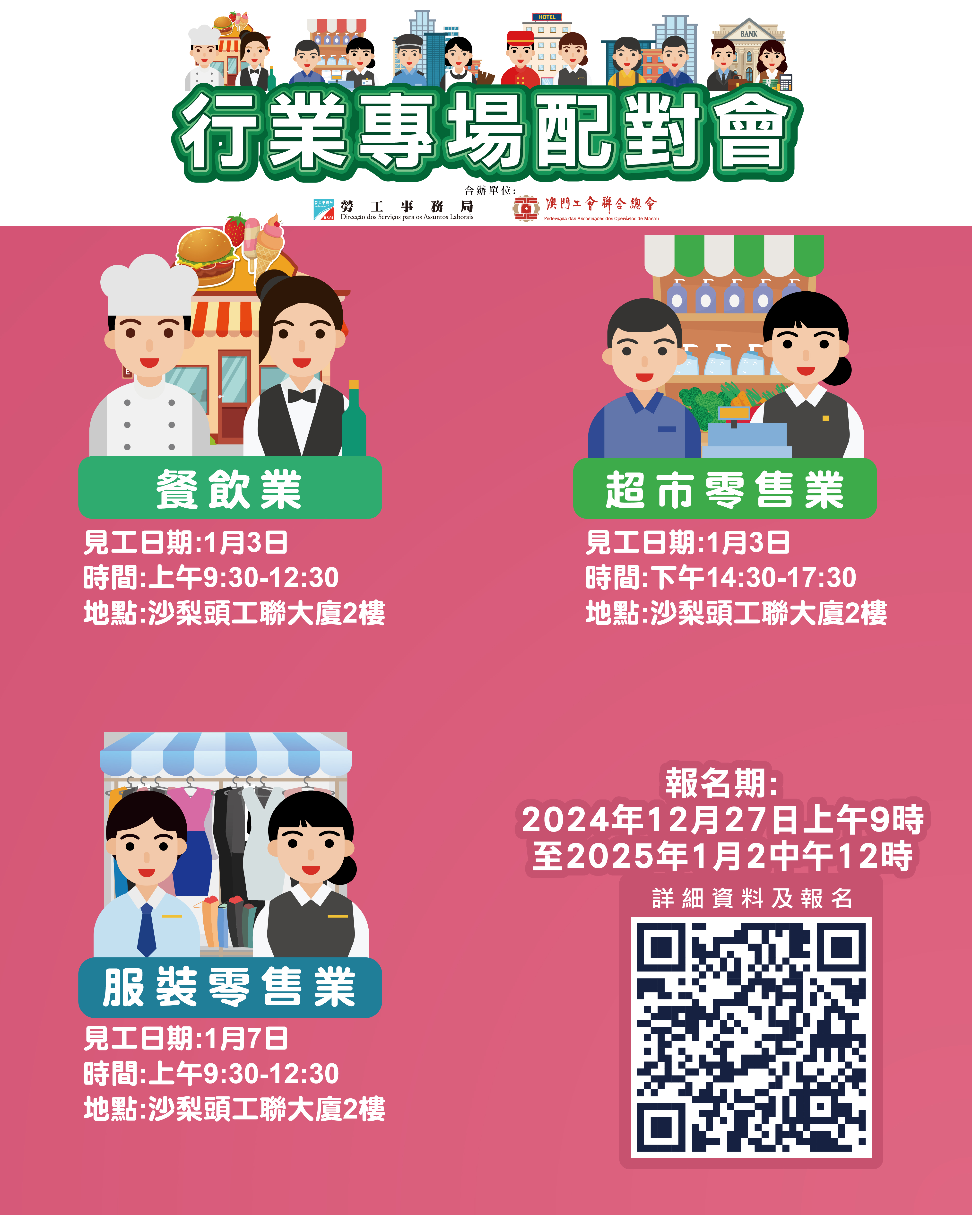 為協助有求職需求的澳門居民盡快就業,以及為緩解業界的人資需求的壓力,勞工事務局與澳門工會聯合總會合作1月上旬舉辦3場行業專場配對會,合共提供204個空缺。報名日期為12月27日上午9時至2025年1月2日中午12時。