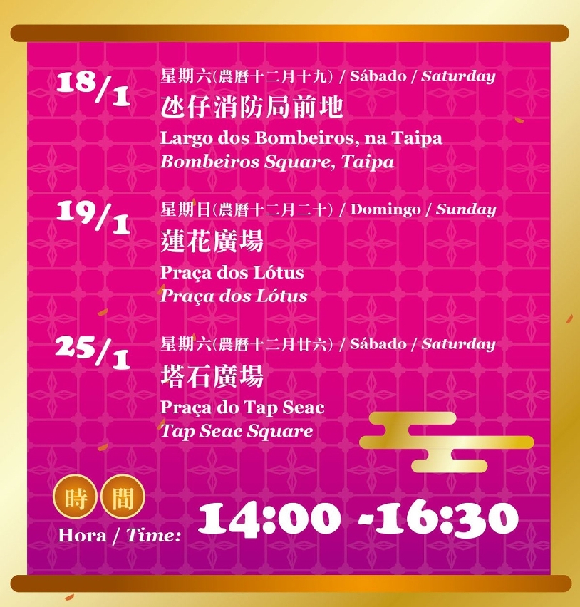 首場活動將於明年一月十八日在氹仔消防局前地拉開序幕,另外兩場將分別於一月十九日在青洲坊蓮花廣場及一月廿五日在塔石廣場舉辦,活動時間均為下午二時至四時三十分。市民除了可駐足欣賞書法家及學生即席揮毫外,亦能獲派揮春,同場更設有攤位遊戲及手作坊,製作特色賀年小擺設及親手書寫獨一無二的揮春。市政署誠邀市民大眾參與活動,為家居增添節日揮春的同時,亦將有禮態度融入生活中,共迎和諧福滿的乙巳蛇年。
