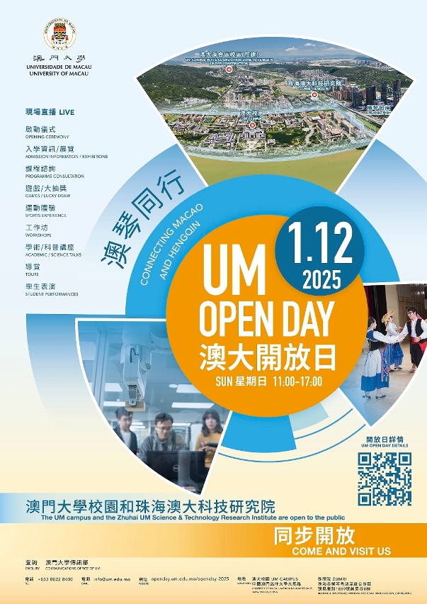 詳情請瀏覽澳大官網;或關注澳大官方微信“澳門大學”和澳大臉書“University of Macau”。如有查詢,請致電8822 8400或電郵至info@um.edu.mo 與澳大傳訊部聯繫。