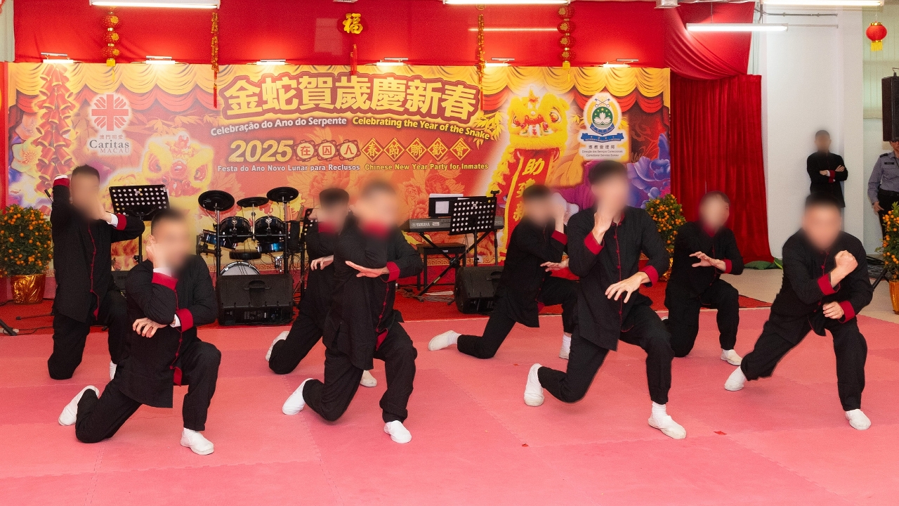 首場春節聯歡會在1月15日上午舉行,邀請多個政府部門及社服機構代表出席,並由保安司司長黃少澤、懲教管理局局長程况明及澳門明愛總幹事潘志明共同主持醒獅點睛儀式。隨着鑼鼓聲響起,春節聯歡會正式拉開序幕,由在囚人演出的節目輪番登場,包括舞獅、多國語言大合唱、旗舞、中國武術和傘舞,以及獻唱自創歌曲等表演。豐富精彩的表演,充分展示了在囚人的才藝,獲得了全場熱烈的掌聲。最後,聯歡會在溫馨歡樂的大合唱中圓滿結束。