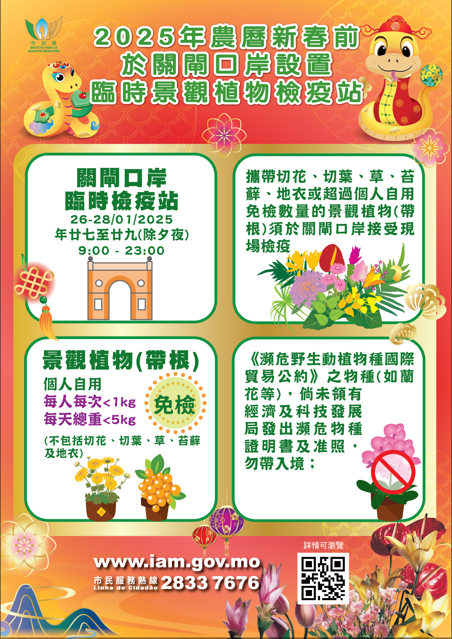 臨時景觀植物檢疫站只設於關閘口岸,運作時間由一月二十六日至二十八日,每日上午九時至晚上十一時,市民如攜帶年花回澳,要注意所攜帶入境的植物僅供個人自用;切花、切葉、草、苔蘚及超過免檢數量的景觀植物(帶根)務必於關閘口岸接受現場檢疫;每名入境人士攜帶的景觀植物(帶根)每次不超過一公斤,每日攜帶總重量不超過五公斤時,則不用接受檢疫。凡須依法接受植物檢疫而沒有檢疫之進口景觀植物,將由具監察職權的主管當局扣押並處理,而具權限當局亦會依法對違法者追究法律責任。