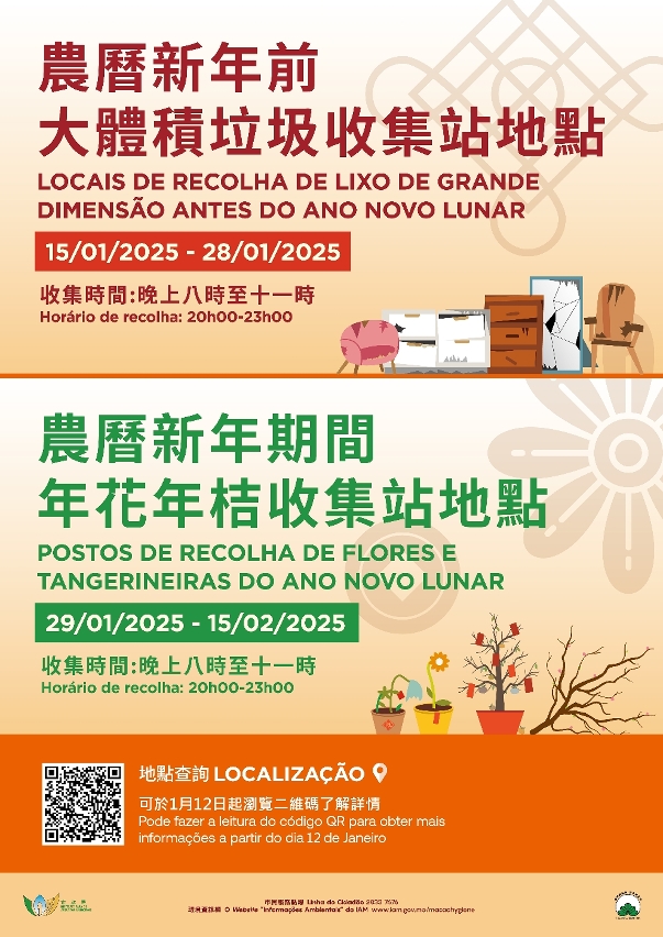 各收集站均設告示牌供市民識別,詳細位置可掃瞄海報上二維碼或於環境資訊網(www.iam.gov.mo/macaohygiene)查閱。市政署呼籲市民配合相關安排,妥善棄置廢舊家具及年花年桔,以免影響環境衛生及阻礙行人通行,違者可被科處罰款。而為了應對垃圾量增加,市政署將加強巡視,協調外判商增派人員及車輛清運垃圾,避免垃圾堆積。