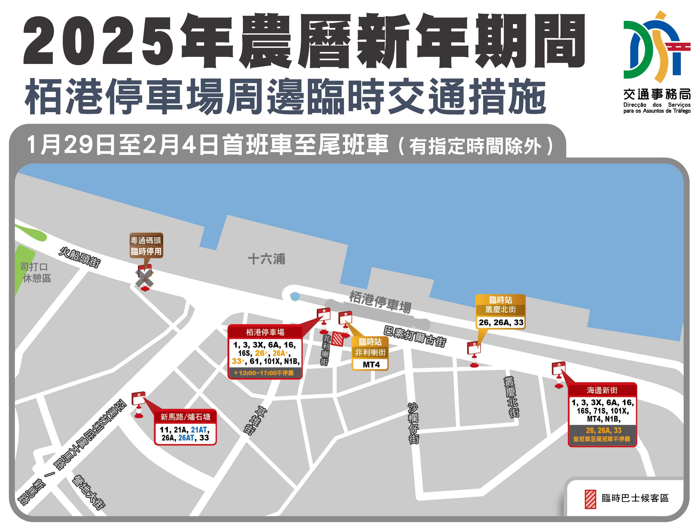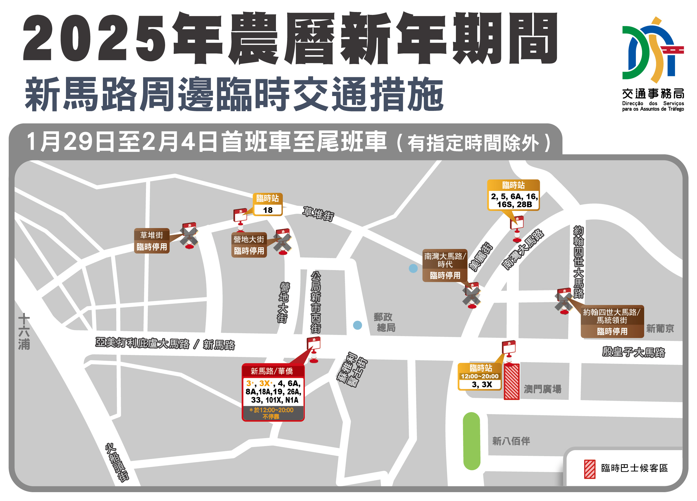 新馬路及周邊區域參考過往節假日分流方案實施臨時措施,包括:1月29日(周三)中午12時至2月4日(周二)至晚上8時,羅保博士街往殷皇子大馬路方向路口臨時封閉,用作設置排隊設施供前往關閘方向的乘客候車;期間每日中午12時至晚上8時,3及3X路線臨時不停靠“新馬路/華僑”站,改為停靠設於殷皇子馬路近羅保博士街的臨時站再按原線行駛;1月29日(周三)至2月4日(周二),“草堆街”站及“營地大街”站臨時合併,於兩站之間設置臨時巴士站供乘客上落;“南灣大馬路/時代”站、“約翰四世大馬路/馬統領街"站亦會臨時停用,“南灣大馬路/時代”站往水坑尾方向約100米會設置臨時站;“海邊新街”站、“栢港停車場”站實施臨時分流,於巴素打爾古街近非利喇街及近叢慶北街分別設置臨時巴士站,分流MT4、26、26A、33路線,讓乘客於不同位置上落車以加快疏導。配合有關安排,周邊道路需實施臨時交通管制措施。上述相關巴士路線臨時調整詳情,可參閱附表或瀏覽兩巴網站(澳巴:www.tcm.com.mo、新福利:www.transmac.com.mo)。