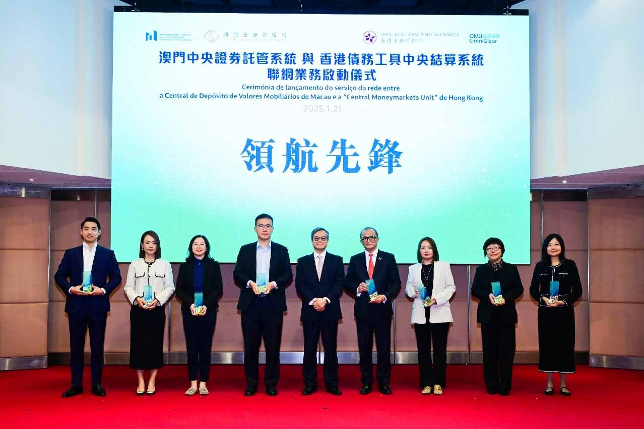 在澳門金融管理局(澳門金管局)和香港金融管理局(香港金管局)的支持下,澳門中央證券託管結算一人有限公司(MCSD)與迅清結算有限公司(迅清結算)共同主辦的“澳門中央證券託管系統(CSD)與香港債務工具中央結算系統(CMU)聯網業務啟動儀式”於今(21)日圓滿舉行。
