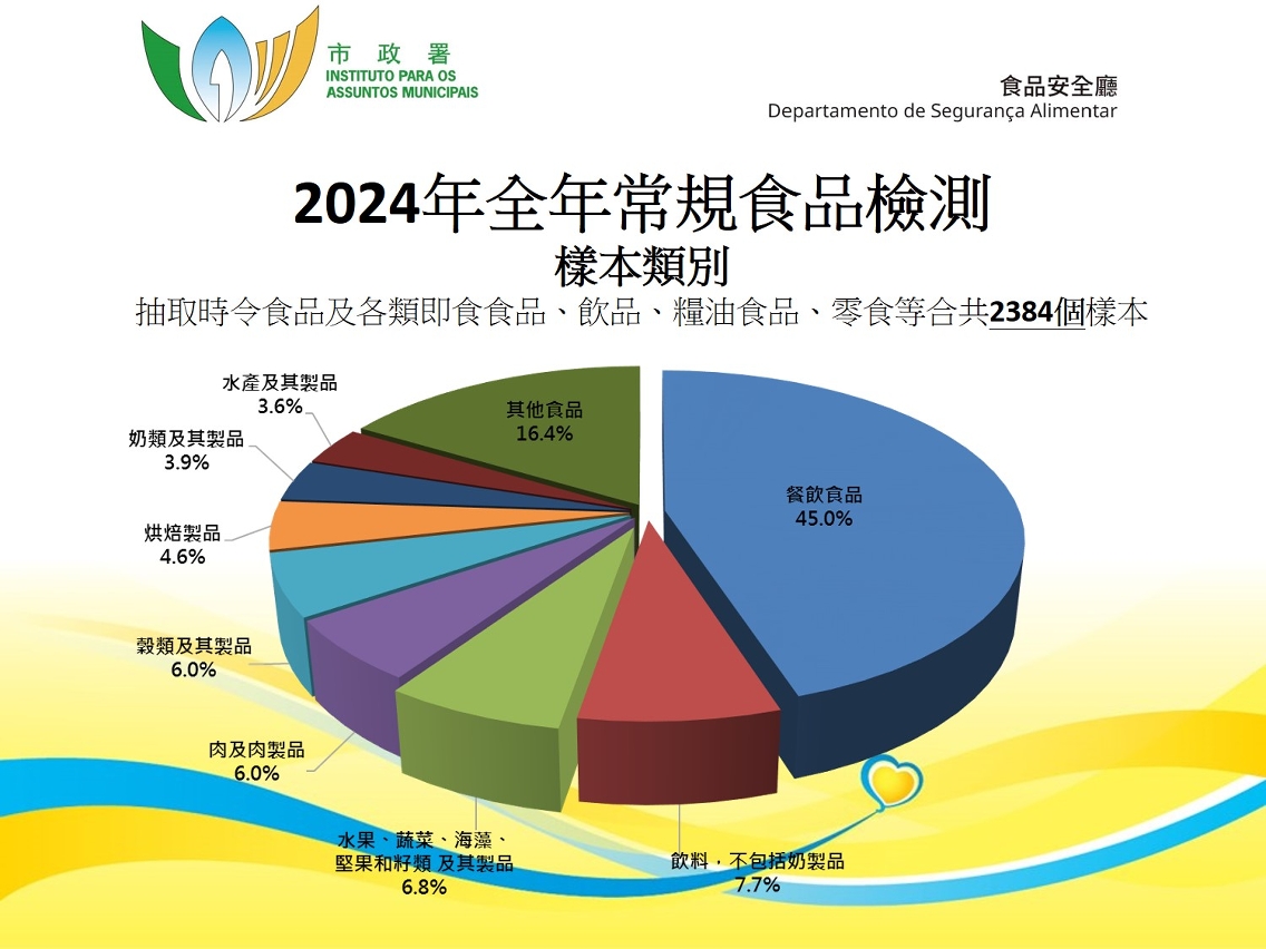 總結二○二四年食品檢測結果,市政署在市面上合共抽取了二千三百八十四個食品樣本,當中包括一百七十個時令節日食品樣本、一千一百四十一個一般市售食品樣本、一千○七十三個餐飲食品樣本,有十個樣本未能通過檢測,其餘樣本未見異常,整體合格率達百分之九十九以上。市政署已對不合格樣本作即時跟進處理,要求本澳商戶停售及銷毀有問題產品,追查來源及製備流程;亦即時發出新聞稿公佈有關情況。