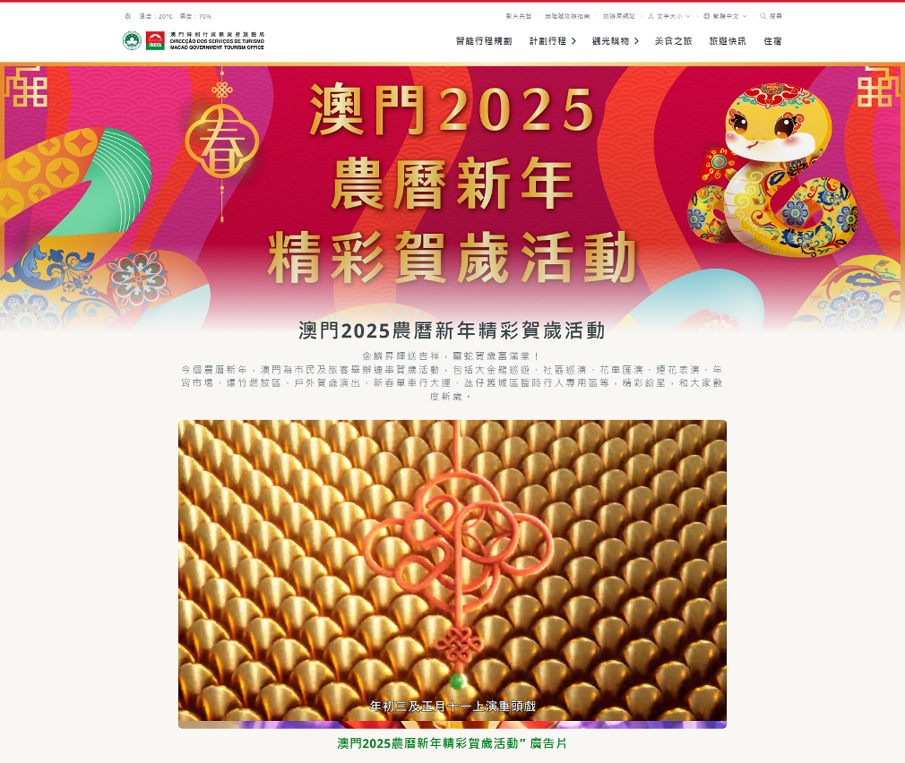 “澳門2025農曆新年精彩賀歲活動”專頁(https://www.macaotourism.gov.mo/article/cny/celebrations-2025)今(26)日開通,設有繁簡中文、葡語及英語版本。經整合旅遊局、經濟及科技發展局、文化局、體育局及市政署等政府部門和旅遊業界舉辦多元賀歲活動的資訊及相關宣傳短片,方便居民和旅客隨時上網查閱,掌握澳門的新春節目。