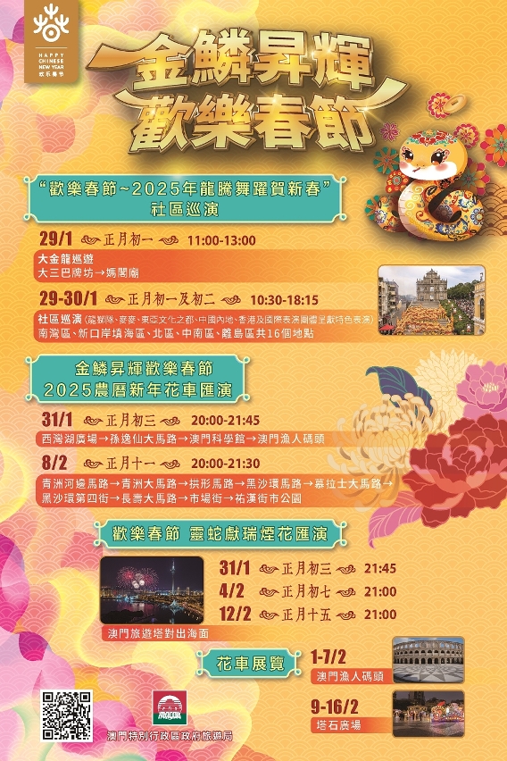 旅遊局將於春節期間呈獻三項獲列入“歡樂春節”活動框架的賀歲活動,包括“歡樂春節─2025年龍騰舞躍賀新春”社區巡演(1月29日及30日)、“金鱗昇輝歡樂春節 2025農曆新年花車匯演”(1月31日至2月16日)及三場“歡樂春節靈蛇獻瑞煙花匯演”(1月31日、2月4日及12日) ,展現澳門“旅遊+盛事”的實力與魅力,進一步豐富世界旅遊休閒中心的文旅內涵。