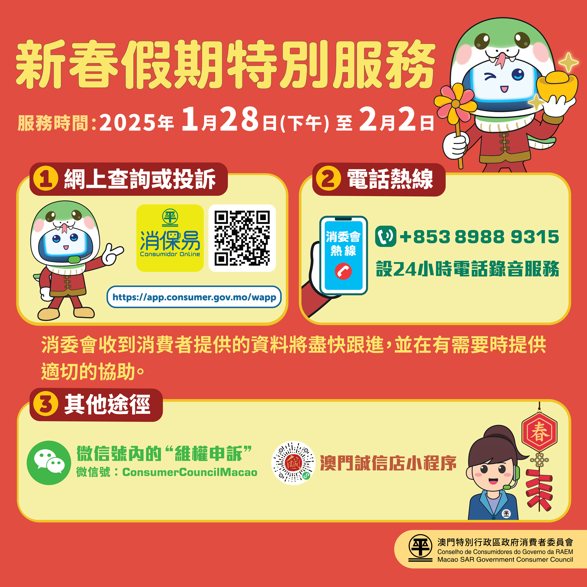 消費者於上述期間,如有查詢或投訴可透過以下途徑聯絡消委會: