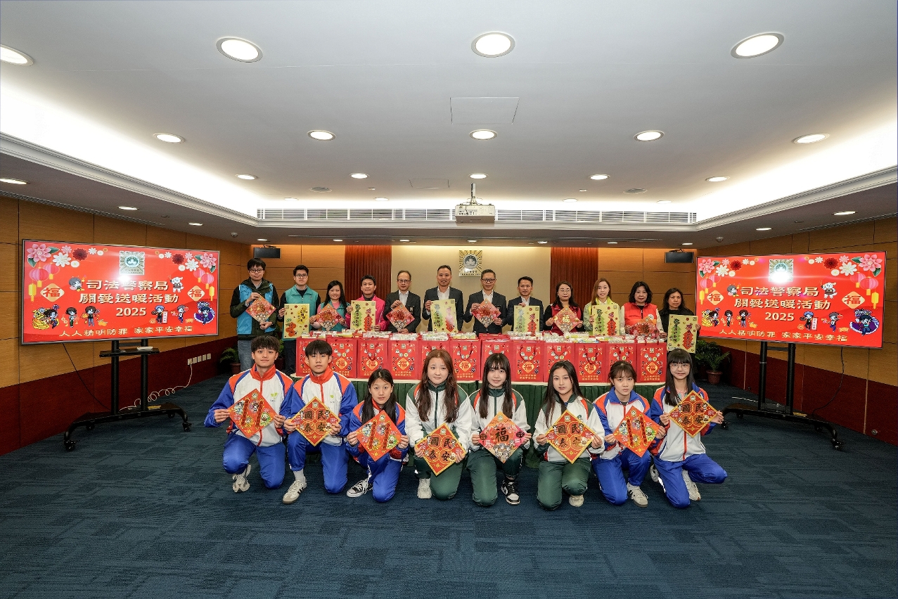 為弘揚關愛共融和奉獻精神,並向社會大眾傳遞支持與關懷復康人士的正面訊息,司法警察局聯同“大廈防罪之友"和“婦女防罪之友"成員、“社區安全青年領袖計劃"及“滅罪小先鋒種子計劃"(下稱“兩項青年計劃")學員前往明愛學校探訪學童,送上新春福包和節日祝福,祝願他們新年快樂,健康成長。