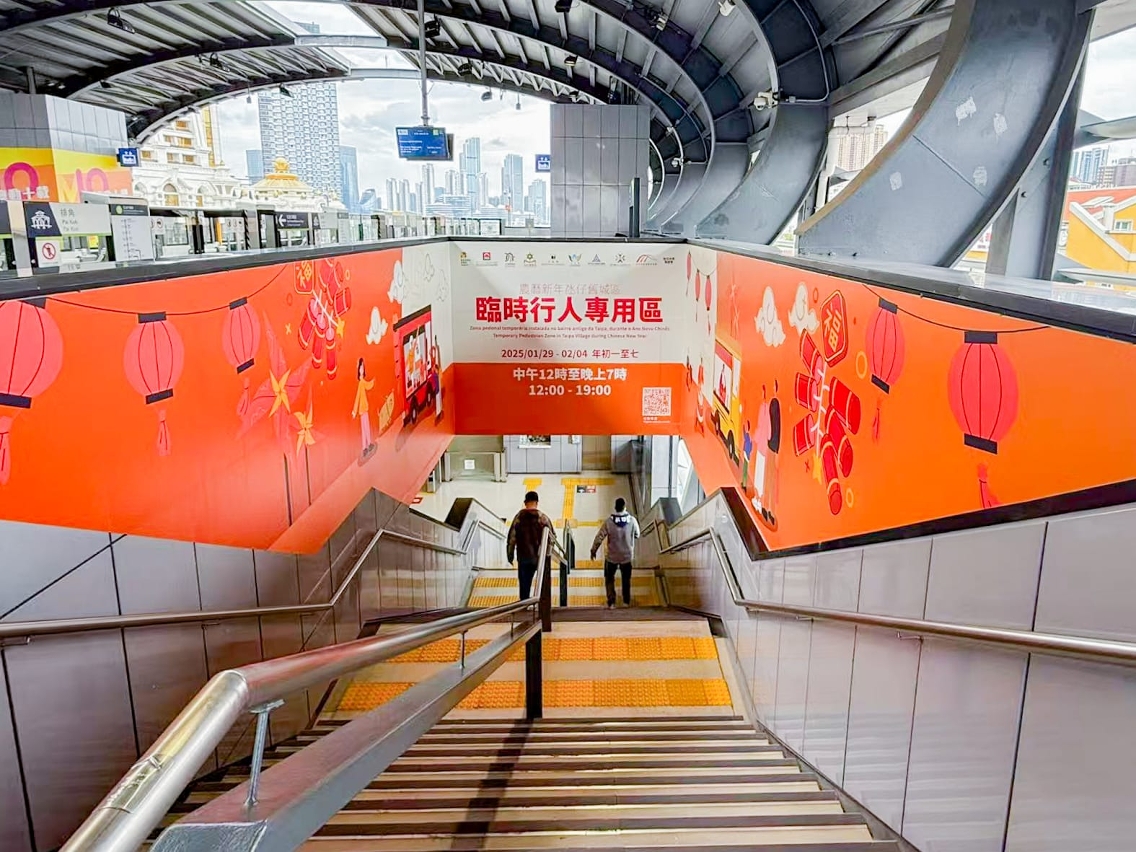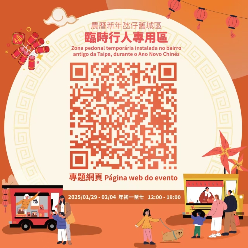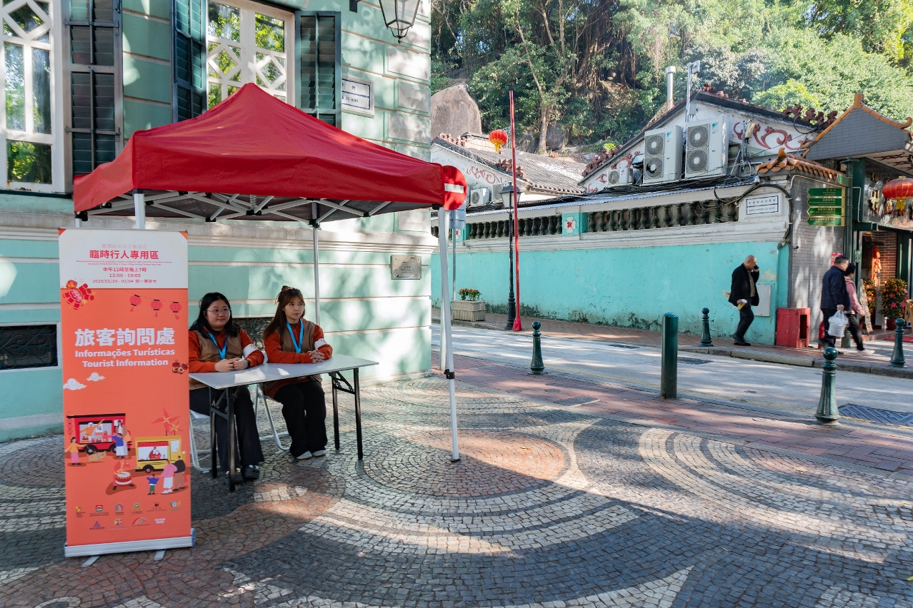 為確保新春期間氹仔舊城區人流及交通有序通行,營造舒適安全的環境,經濟及科技發展局、交通事務局、治安警察局、旅遊局、文化局及市政署,聯同澳門街坊會聯合總會、氹仔社區發展促進會、氹仔坊眾聯誼會及澳門離島工商業聯合會合作設置“農曆新年氹仔舊城區臨時行人專用區”。