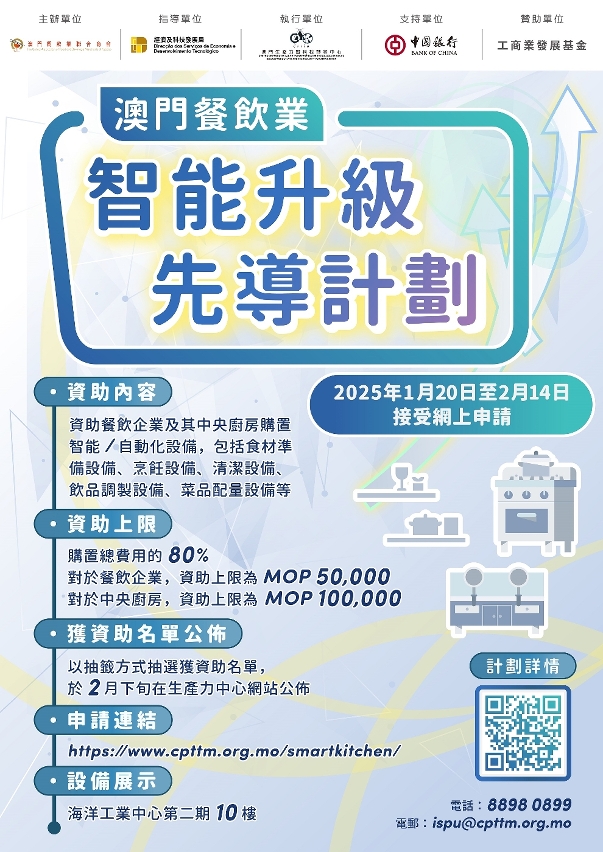 本次計劃由澳門餐飲業聯合商會主辦、經濟及科技發展局指導、澳門生產力暨科技轉移中心負責執行。該計劃以資助形式,支持本澳餐飲企業及其附屬的中央廚房進行設備升級。申請對象可根據自身需求提出申請購置智能或自動化設備,資助最高可達相關費用的八成。對於餐飲企業,資助上限為50,000澳門元;對於中央廚房,資助上限為100,000澳門元。