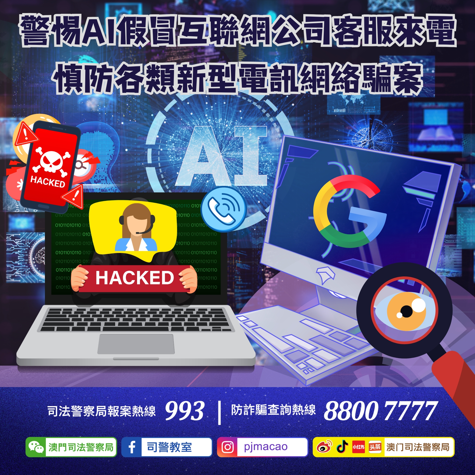 司警局近日發現有新聞報導指騙徒假冒Google公司客服,並利用AI技術模擬真人語音致電市民,謊稱市民帳戶已被盜用並暫時封鎖,誘導其重設密碼,從而竊取帳戶憑證。至今司警局未接獲以AI深度偽造或相類似手法的騙案檢舉,司警局將密切留意本澳及鄰近地區的相關情況,倘若在本澳出現,將立即向市民作出預警。