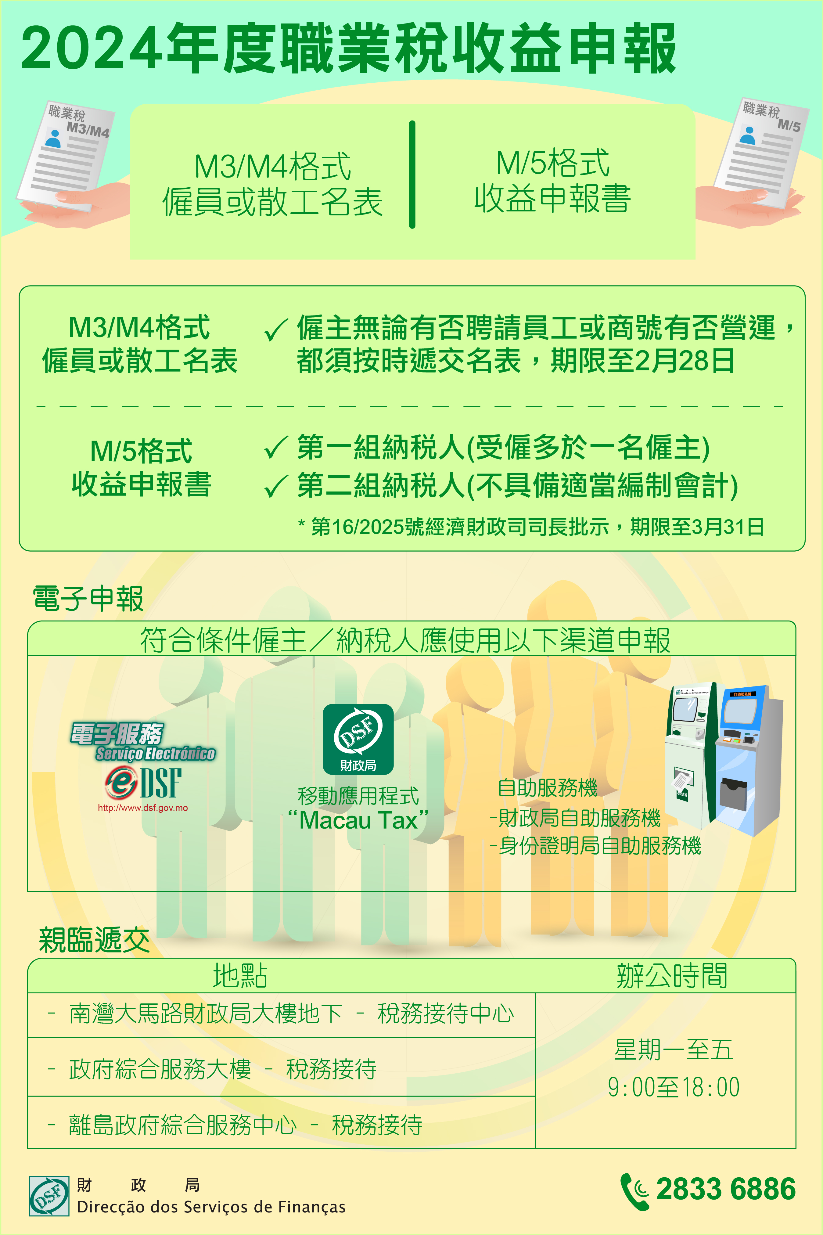 根據第2/78/M號法律核准之《職業稅規章》第十三條之規定,2024年度職業稅第一組M3/M4格式(僱員或散工名表)遞交期限至2月28日;另根據第16/2025號經濟財政司司長批示,倘收益從多於一位僱主處取得的職業稅第一組納稅人,又或不具備適當編制會計的職業稅第二組納稅人,遞交2024年度職業稅M/5式收益申報書的期限至3月31日。