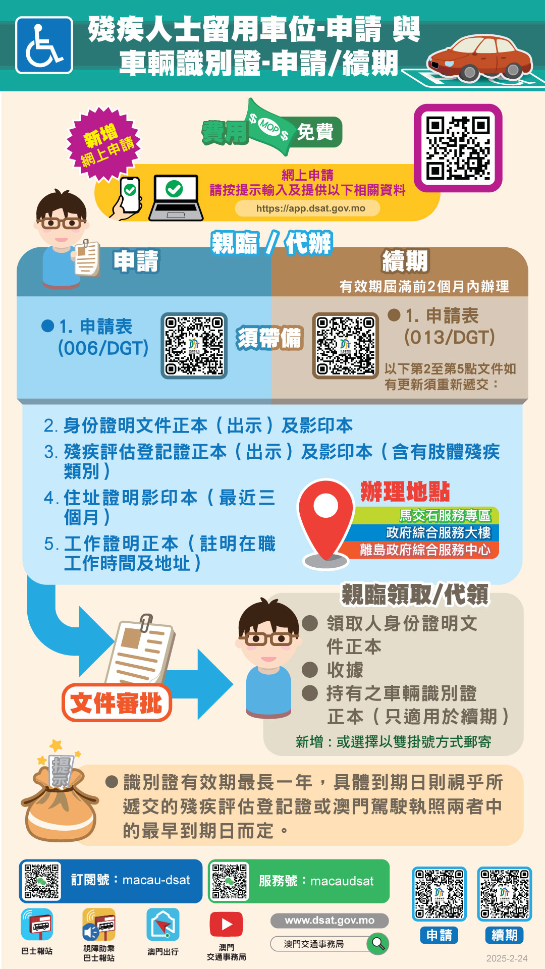 交通事務局為進一步推動電子政務,實現市民“一次跑”完成手續,由2月24日(周一)起新增網上辦理“殘疾人士留用車位”之申請,以及“殘疾人士車輛識別證”之申請及續期服務。有需要人士可登入交通事務局網上服務https://app.dsat.gov.mo,並按提示輸入及提供相關資料,以完成相關申請或續期手續。