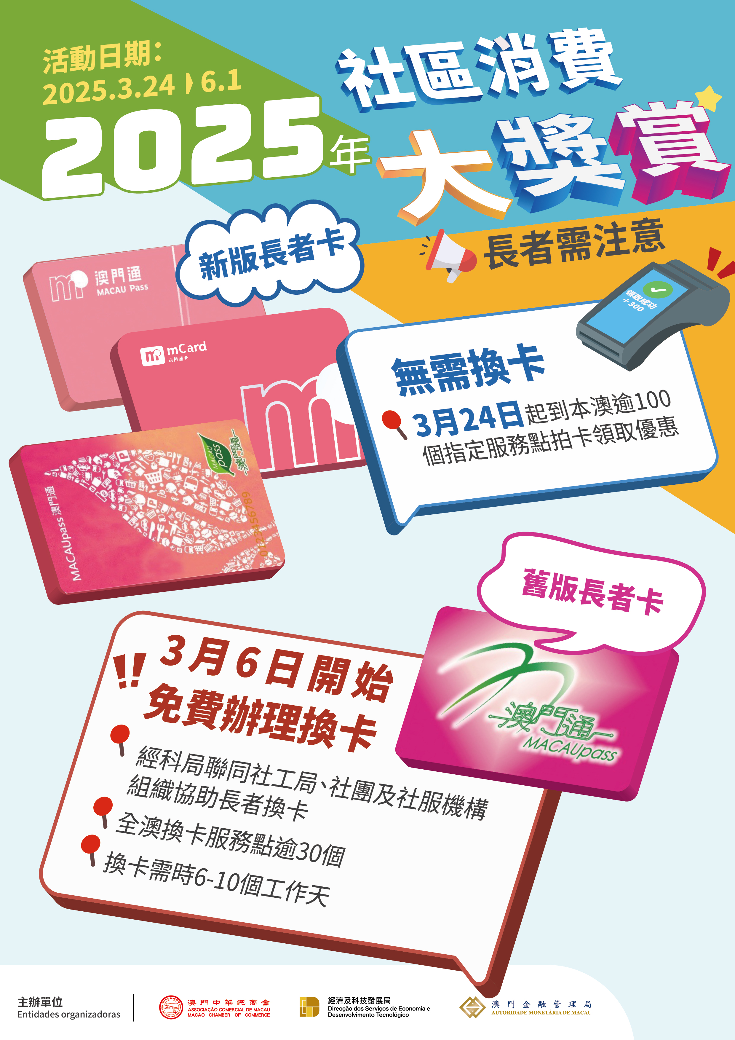 “2025年社區消費大奬賞”大型促消費活動將於3月24日推出,是次活動增設“長者消費立減優惠”,年滿65歲的長者可憑澳門通長者卡拍卡領取總額300元的消費立減優惠。